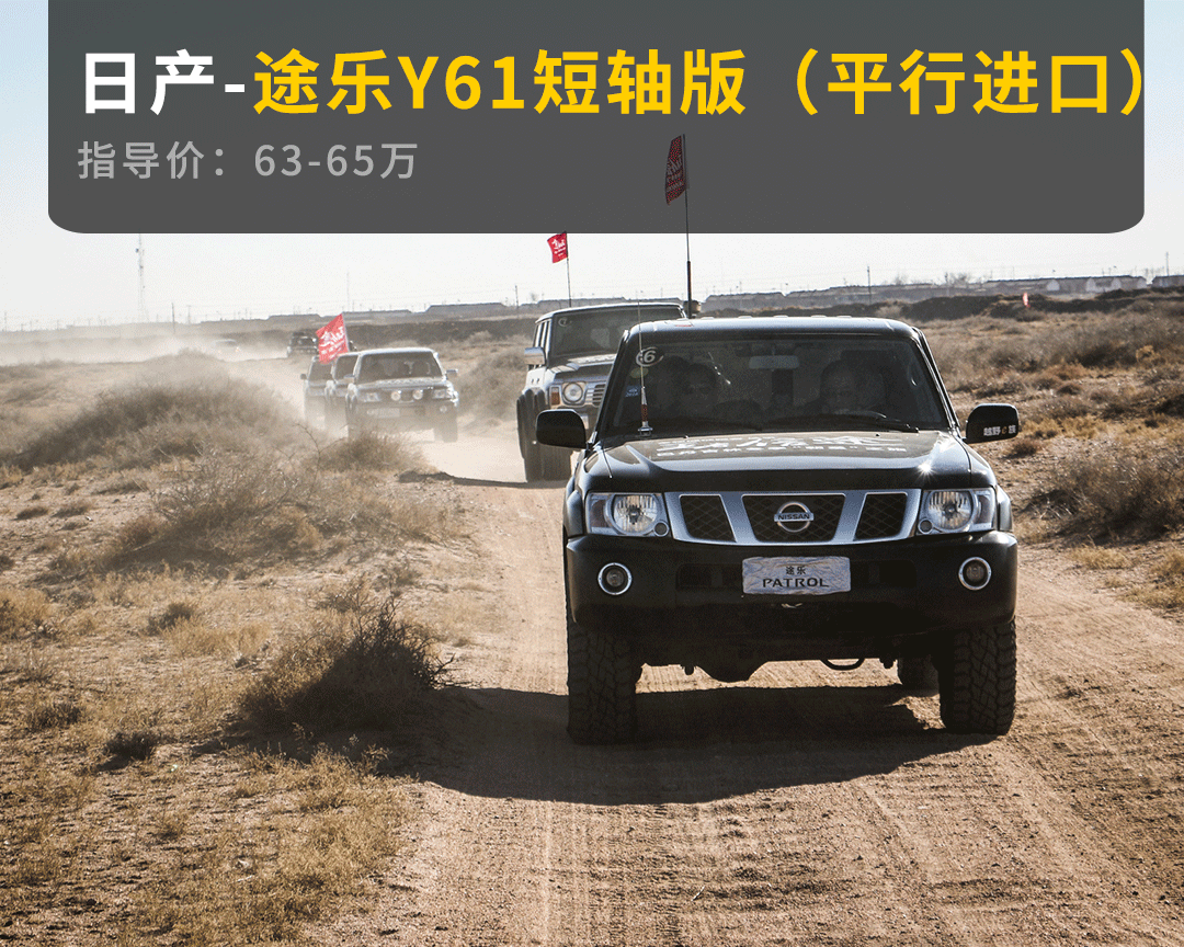 途乐Y61因为中东地区的刚需而和新款Y62同堂生产至今,三门短轴版和五门长轴版一样在平行进口渠道有售。前后非独立整体桥悬挂赋予了极大的悬挂行程,分时四驱+前后双差速锁能在只有一个轮胎接地的情况下顺利脱困,4.8大排量直六自吸汽油机给越野提供了强大的动力保障,即使是去冲低附着力的沙坡后劲也非常充足,不愧途乐Y61沙漠王子的称号,短轴距也使得过坡顶和窄路时比长轴版通过性更强。