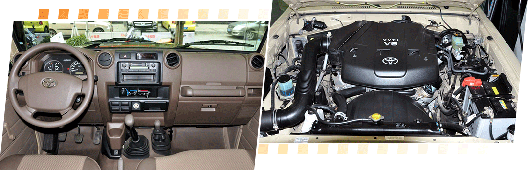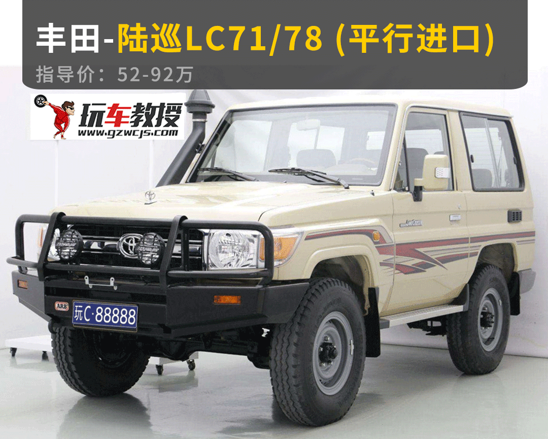 陆巡LC70系列可以说是汽车界的活化石,从1984年一直生产至今,方正的外形还是当年的味道,只是发动机换成了带VVT-i技术的1GR 4.0自吸汽油机和4.5T涡轮增压柴油机。高配车型还自带宽轮眉车身、竞技型前保险杠、绞盘、涉水器、备用外挂油箱和前后双差速锁,越野装备齐全,除了没有机关枪,其它都和国际热点地区新闻上看到的丰田车一模一样,十分有军事硬派feel!目前平行进口渠道可以买到LC70中东版的各种型号,其中三门版有短轴三门LC71和长轴三门LC78。