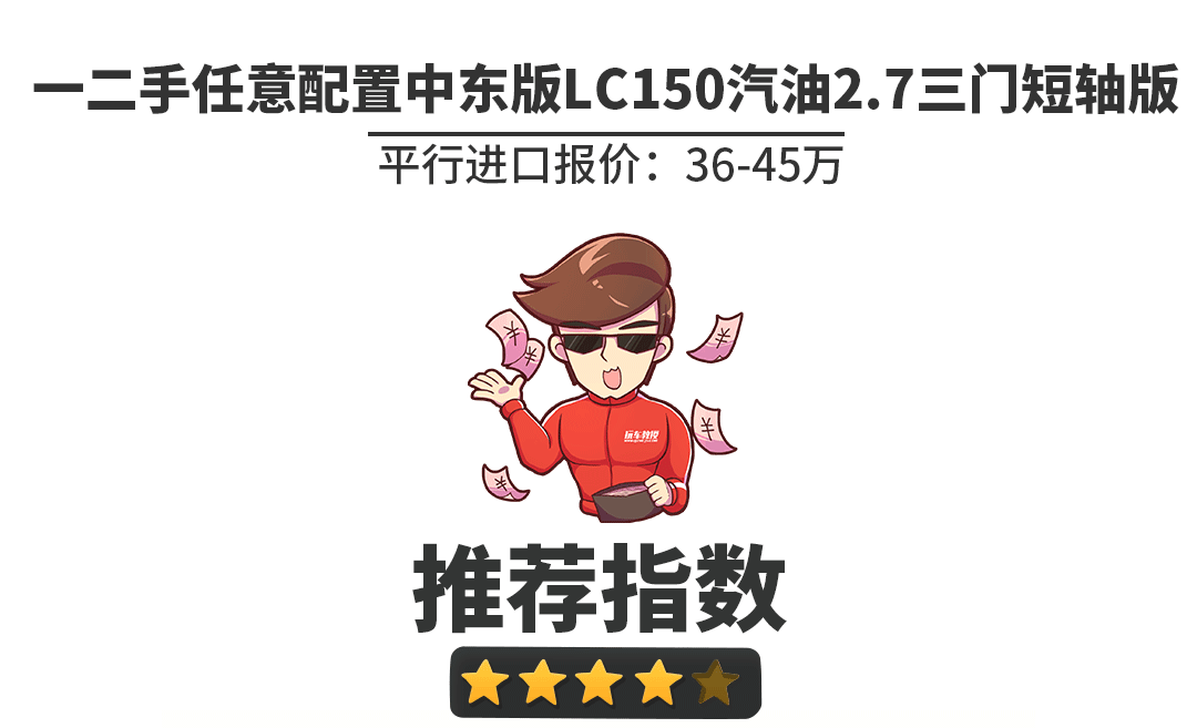 为什么值得买:首先,由于三门版车重减轻,五门版霸道2700动力不足的缺点得以改善,不会出现越野和高速时2.7和4.0一样耗油的情况。其次,三门版车型的轴距更短,窄路掉头更加方便,转弯半径更小,比长轴版更大的纵向通过角使得过坡顶更不容易托底,越野通过性不可谓不强悍。而且三门版的造型也不可谓不骚,回头率一等高,泡妞的收割效率也堪比跑车。不过各位老司机要注意,短轴版也不是每一样性能都强于长轴版,短轴距让霸道本来就不低的重心更高了,高速行驶和冲沙更容易翻车。