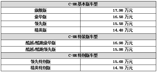 广汽丰田C-HR推出丰富的系列产品,新车搭载全新研发的TNGA 2.0L Dynamic Force Engine发动机,匹配全新Direct Shift-CVT变速箱,基本版四款车型市场建议指导价为14.48万-17.98万元;为响应顾客多样化需求,特别推出两款C-HR特装版车型,包括酷越系列和酷跑系列,市场建议指导价为15.98万-16.98万元;另推出店头加装特别版,市场建议指导价为14.78-15.68万元。