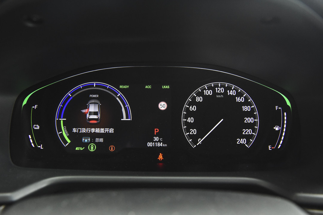 当然混动车型上还具备了HUD抬头显示以及在中央显示屏和驾驶员前方的仪表都加入了混动车型独有的功耗表,能够显示车辆发动机与电池电机之间能量的流通情况,中央显示屏能够与仪表互联,互为补充。