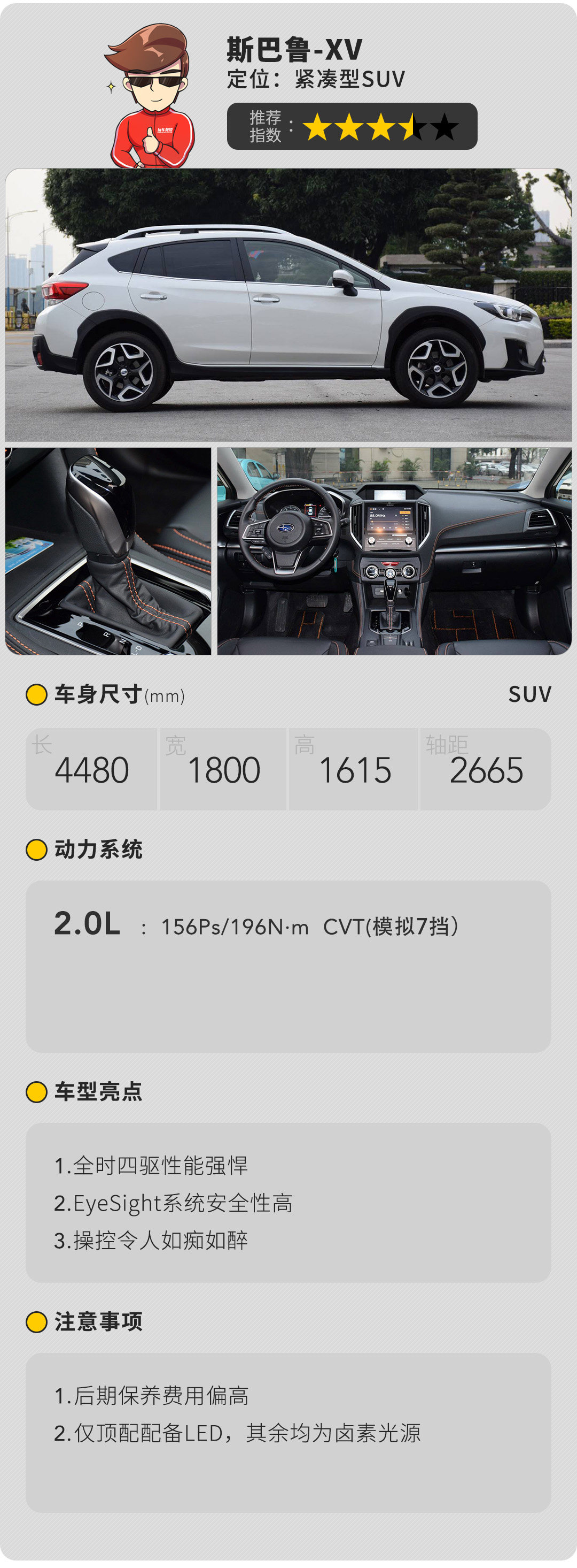 斯巴鲁往往不会将过多的心思的投放在外观和内饰上,新款XV的改变可谓是微乎其微,更换中网与灯组的造型,精细度提高的内饰做工,仅此而已。关键还得看内在,水平对置发动机与全时四驱的黄金组合,造就了左右完全对称的底盘结构,令XV拥有得天独厚的操控乐趣,极大程度的弥补了自吸发动机动力上的不足。