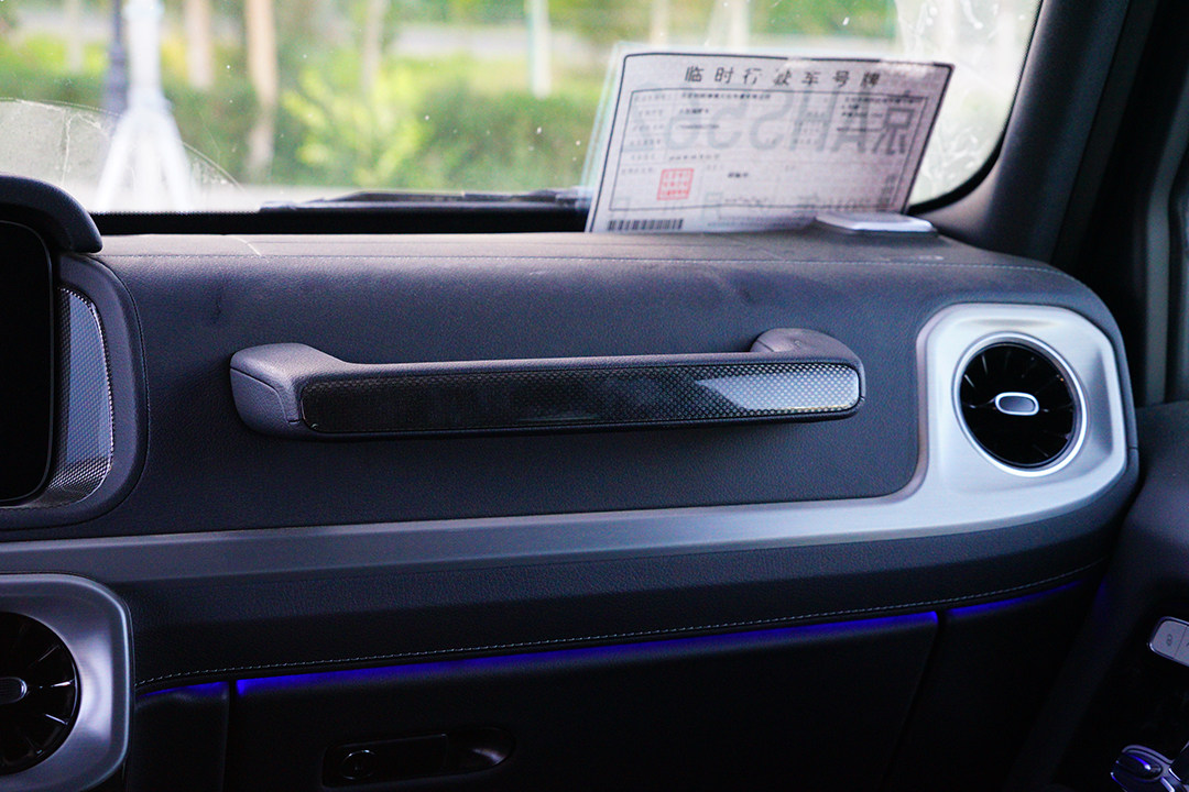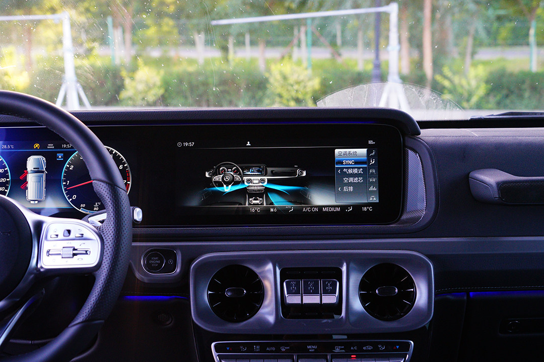 两部12.3英寸显示器在视觉上共同构成了一个宽屏驾驶舱,搭配上绚丽的氛围灯,全新G级的内饰也变得很有档次和豪华感。