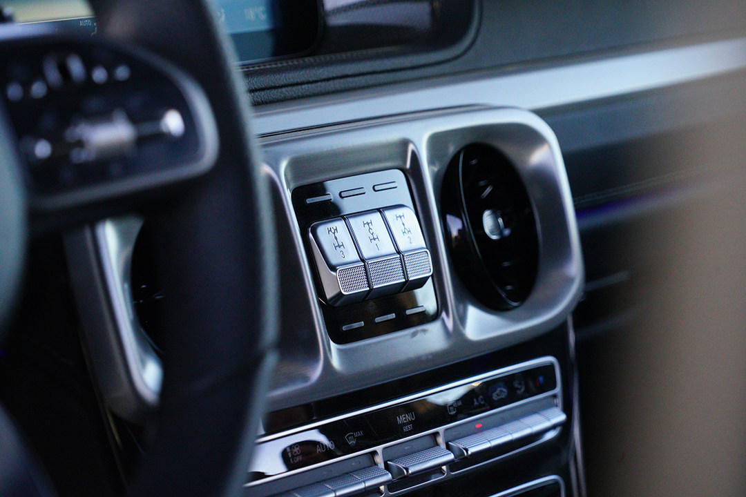 不过G级特有的元素自然不会被扑面而来的豪华所淹没,与前大灯形状相呼应的圆形出风口、副驾驶前方硕大的抓手、以及摆放在中控最中央部分,代表着G身份的三个镀铬差速锁开关,统统都燃点了粉丝们想要去越野的热血。
