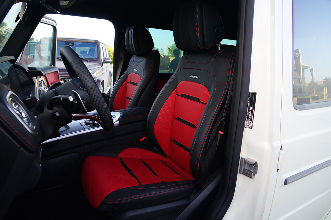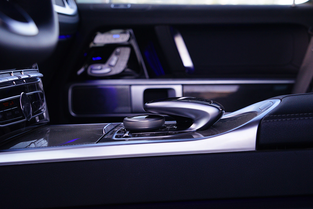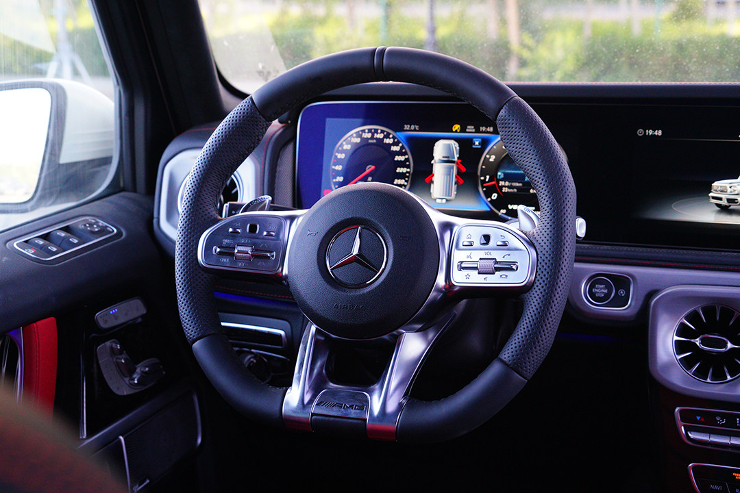 AMG G63则在此基础上,糅合了更鲜明的运动风格,包括方向盘样式的变化、车内大面积红色皮革的运用、以及多处碳纤维饰件的露出。