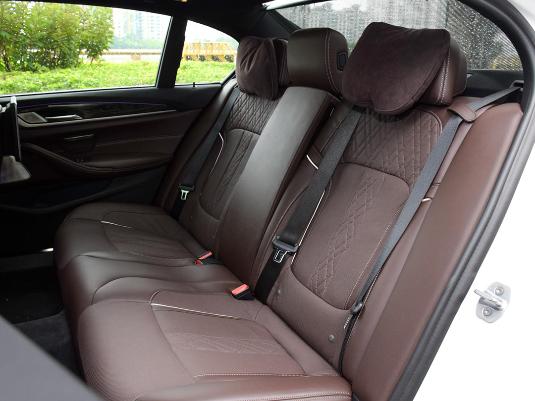 由于5系采用双头枕设计,所以当头部靠到底时,能感受到一定的支撑性。座椅选用Nappa真皮,摸起来虽然稍微硬了一点,但是长途乘坐时的支撑性做得不错,不容易觉得累。