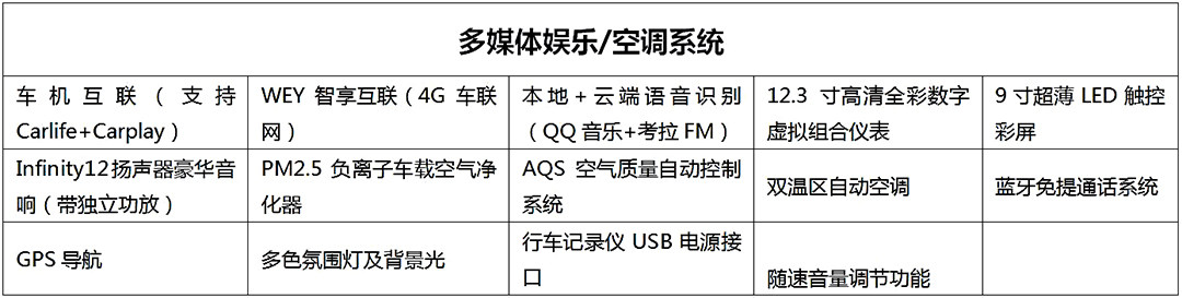 多媒体娱乐系统上,VV6采用12.3寸全彩数字虚拟组合仪表、9寸超薄LED触控中控彩屏;音响装备则采用全球顶级的Infinity,12扬声器带独立功放,营造出一种置身于音乐厅、电影院、舞台剧院的音响效果。