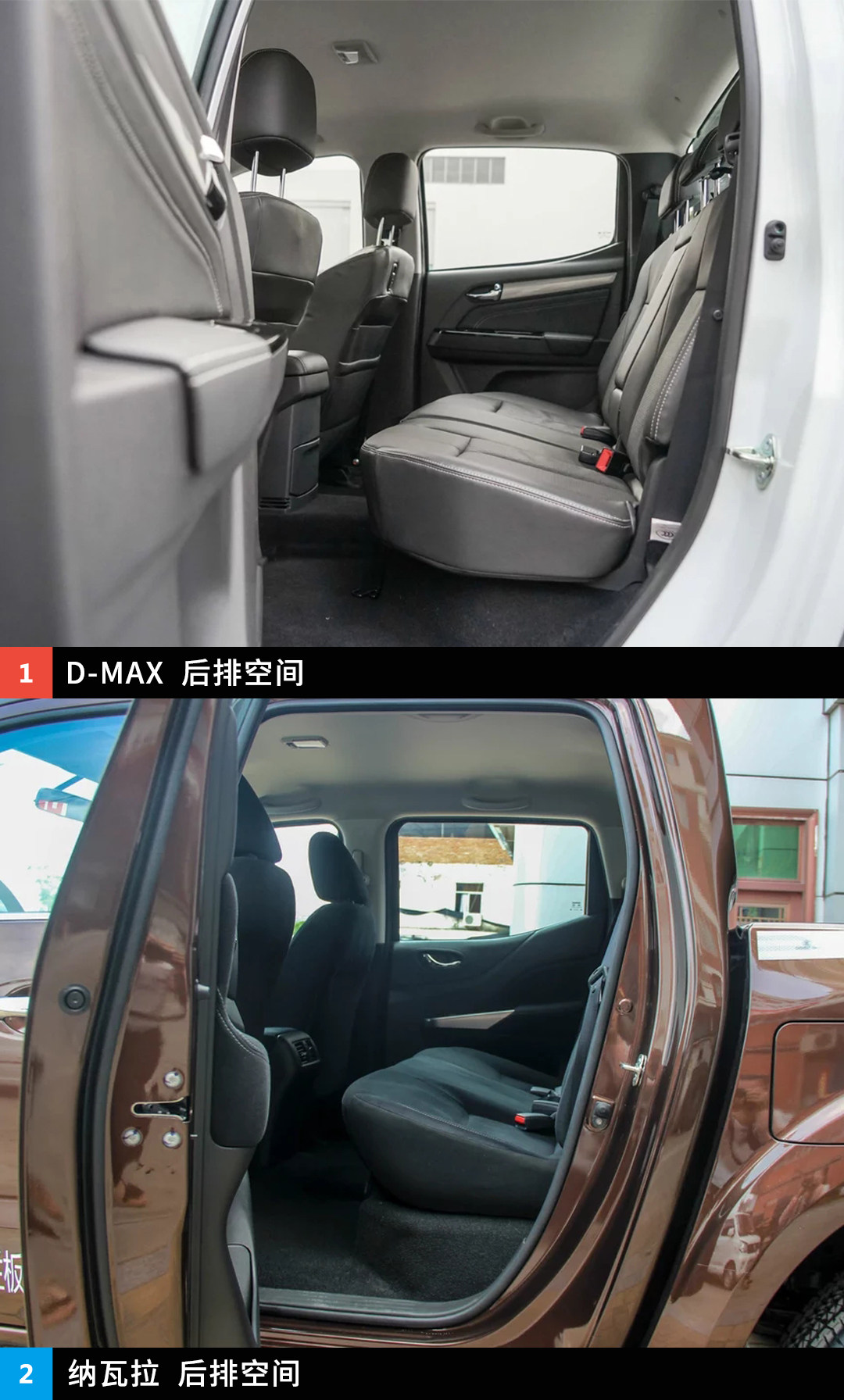作为轴距都超过3米的皮卡,两车的乘坐空间自然得到了保证。实测176cm的体验者调整好前排坐姿,来到D-MAX后排时,头部空间还剩1拳,腿部空间还有两拳半;同样的体验者调整好前排坐姿,坐到纳瓦拉的后排,头部空间还有1拳半,而腿部空间则剩两拳,两车表现互有优劣,不相伯仲。乘坐舒适性方面,纳瓦拉后排座椅采用了内凹设计,使靠背较直而导致的不适有所消弭,中央地板隆起比D-MAX低且较为宽大,基本对中央乘客没有影响,同时带后排中央出风口,唯一的遗憾是后排中央不带头枕,但瑕不掩瑜,总体舒适性表现纳瓦拉较为优异。