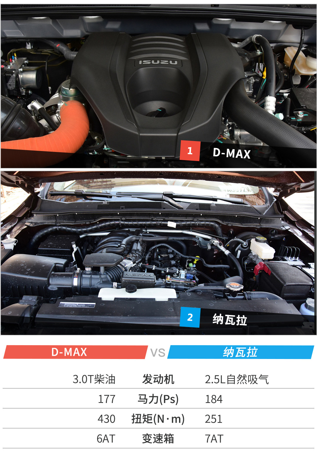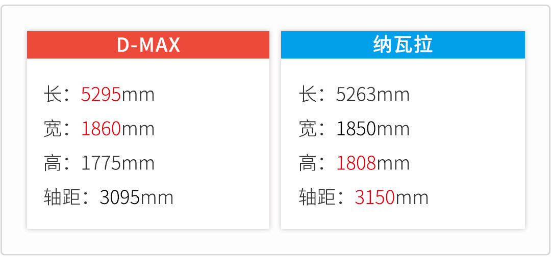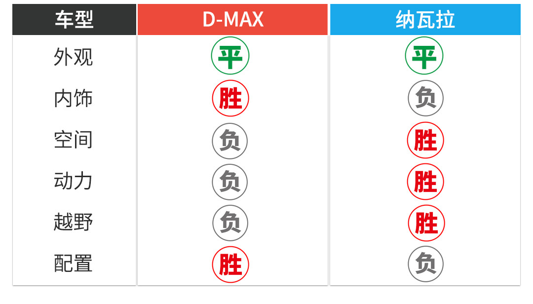 本次对比采用简单粗暴的6局4胜制,分别在外观、内饰、空间、动力、越野、配置六个项目进行比拼,哪位选手取得四场胜利即为本场胜者,为了增加可比性,选取价格相近的D-MAX 3.0T自动四驱超豪华版与纳瓦拉2.5L 自动四驱豪华版进行对比,废话不多说,比赛正式开始。