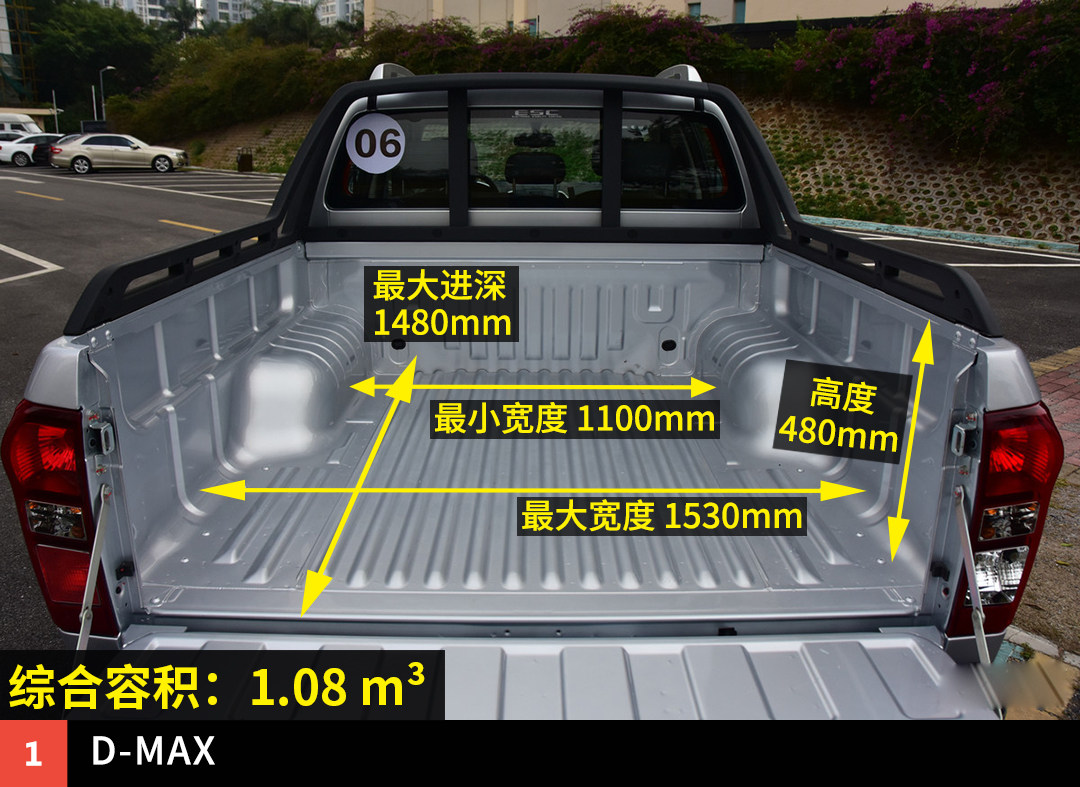 对于皮卡,空间要分两方面来说,一个是正常乘坐空间,另外对购买皮卡的人群来说,必然是对装载能力有刚需,所以后备厢装载空间也是重点考核的一个方面。