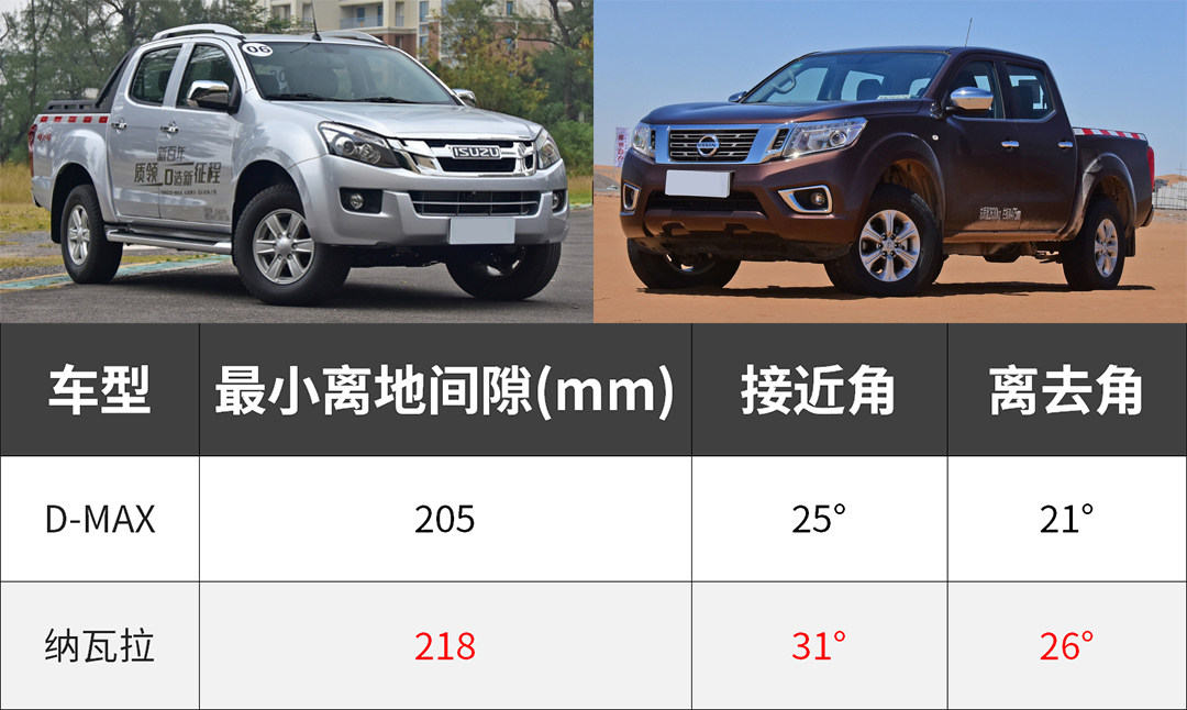 光有外观上的硬派,不存在的,每一辆皮卡都是越野上的小能手,重点是它们并没有硬派SUV的娇贵,小剐小蹭不在话下。两车均为非承载式车身,四驱结构同为电控分时四驱,旗鼓相当。从越野参数来看,纳瓦拉全面领先D-MAX,接近角与离去角已与一众硬派SUV持平(举个例子:丰田普拉多接近角为32°,离去角为26°),故其在崎岖路面会有更好的通过能力。但实际上D-MAX表现已完全满足日常越野需求,带你上山下海完全不成问题。