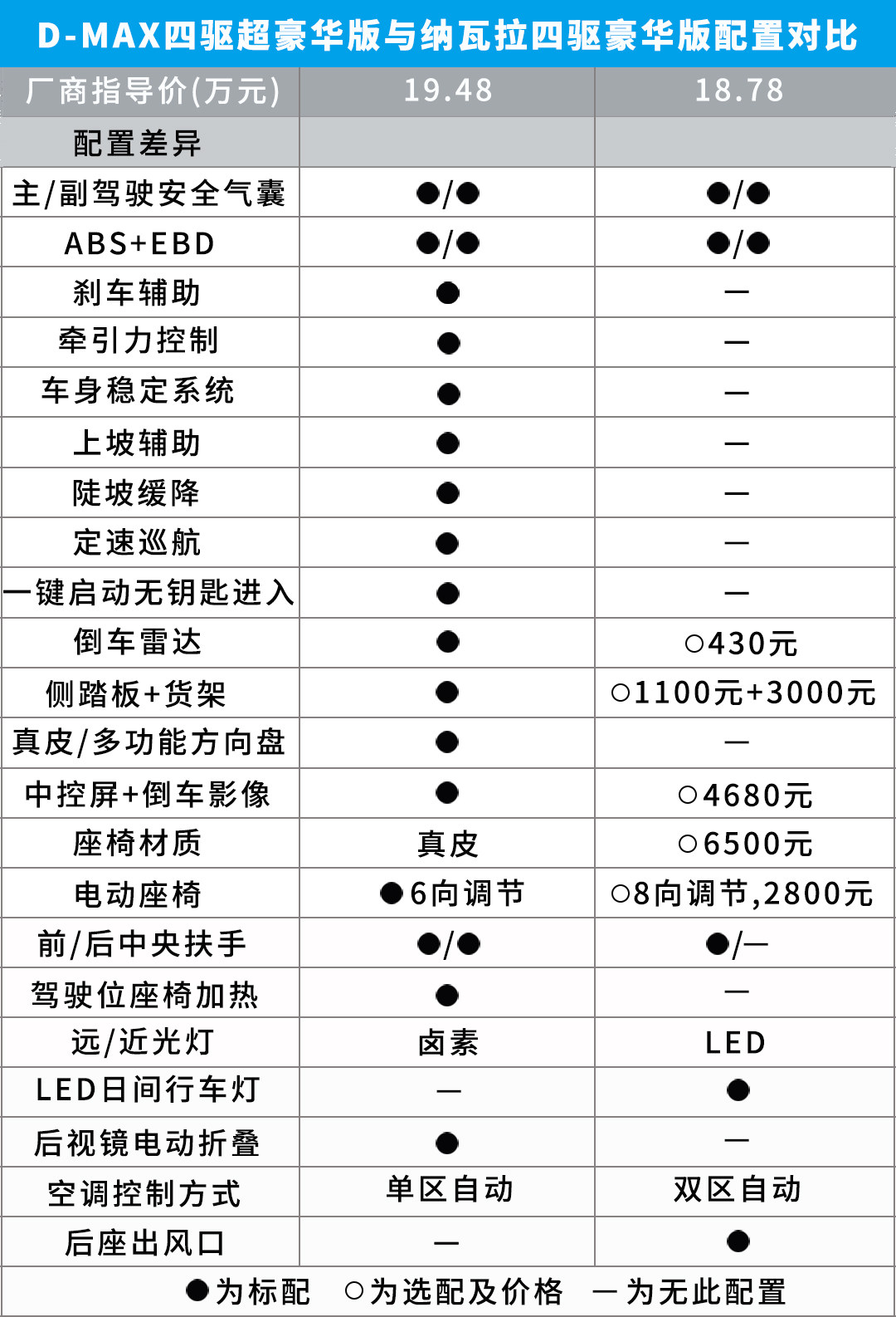 从配置差异表来看,两者优劣立分,虽然D-MAX比纳瓦拉贵七千元,但其多出来的配置可不是一项两项。诸如牵引力控制、车身稳定系统、陡坡缓降之类的配置增强了车辆行驶安全性,而且后期是不容易加装的。诸如真皮座椅、电动座椅调节、中控大屏则可以进一步提升驾乘舒适性及便利性。虽然纳瓦拉配备了LED大灯、双区自动空调、后排出风口等拉回一点分数,但总体跟D-MAX相比而言还是比较素。