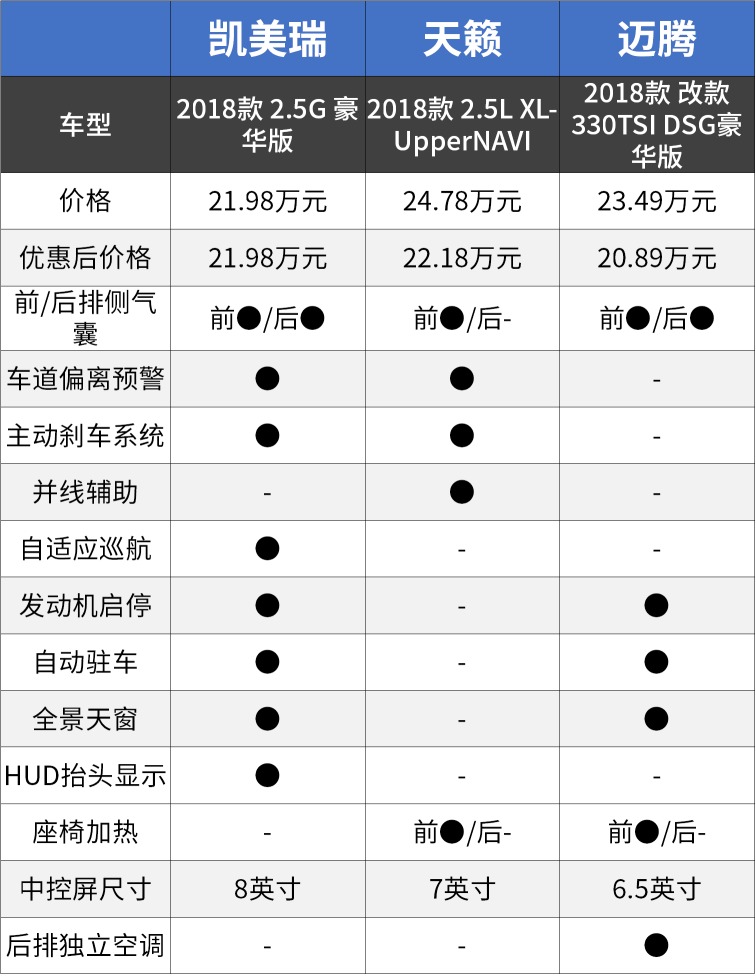 经过教授仔细对比,凯美瑞的配置跟原价贵几万的同级对手相比还有一定的优势。所以一样的预算,大家买到的配置其实是差不多的。