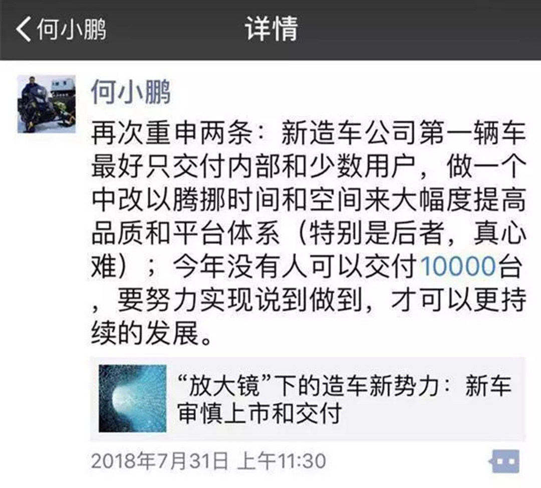 事情的起因是这样的,几天前小鹏汽车董事长何小鹏在朋友圈发布动态称,今年造车新势力没有人能够交付1万辆车。