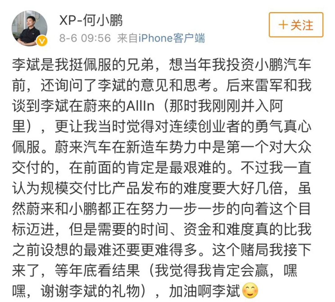 到8月6日,何小鹏在微博和朋友圈同时发文,表示接下这个赌约,最后还不忘调皮一下说谢谢李斌的礼物。至此,这个吸睛的车界赌局形成。