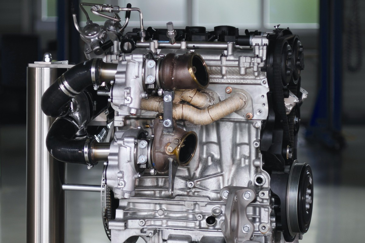 三涡轮增压、450匹马力这就是早前媒体盛传沃尔沃为Polestar开发的高性能2.0T引擎。这台4缸发动机不同之处在于,它把两个气缸分为一组,两组气缸分别单独配备一个废气涡轮,这种做法和3.0T V6发动机的涡轮布置类似。为了提高性能,这台发动机配备了两颗A/R值小的涡轮(大号涡轮),以往小排量引擎配备大号涡轮会出现明显的涡轮迟滞,于是沃尔沃在两颗废气涡轮上又加了一个电子涡轮增压器,在引擎低负荷时电子涡轮将压缩空气打入废气增压器压气机以解决低速涡轮迟滞。