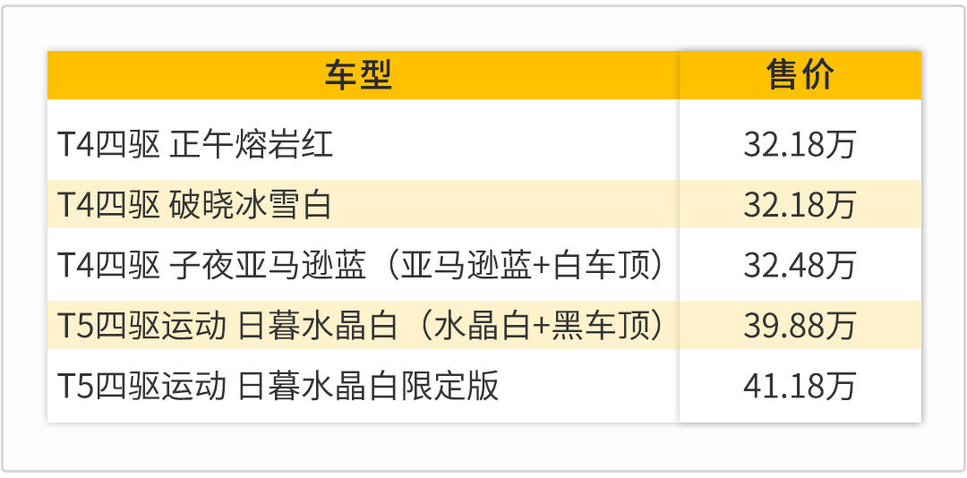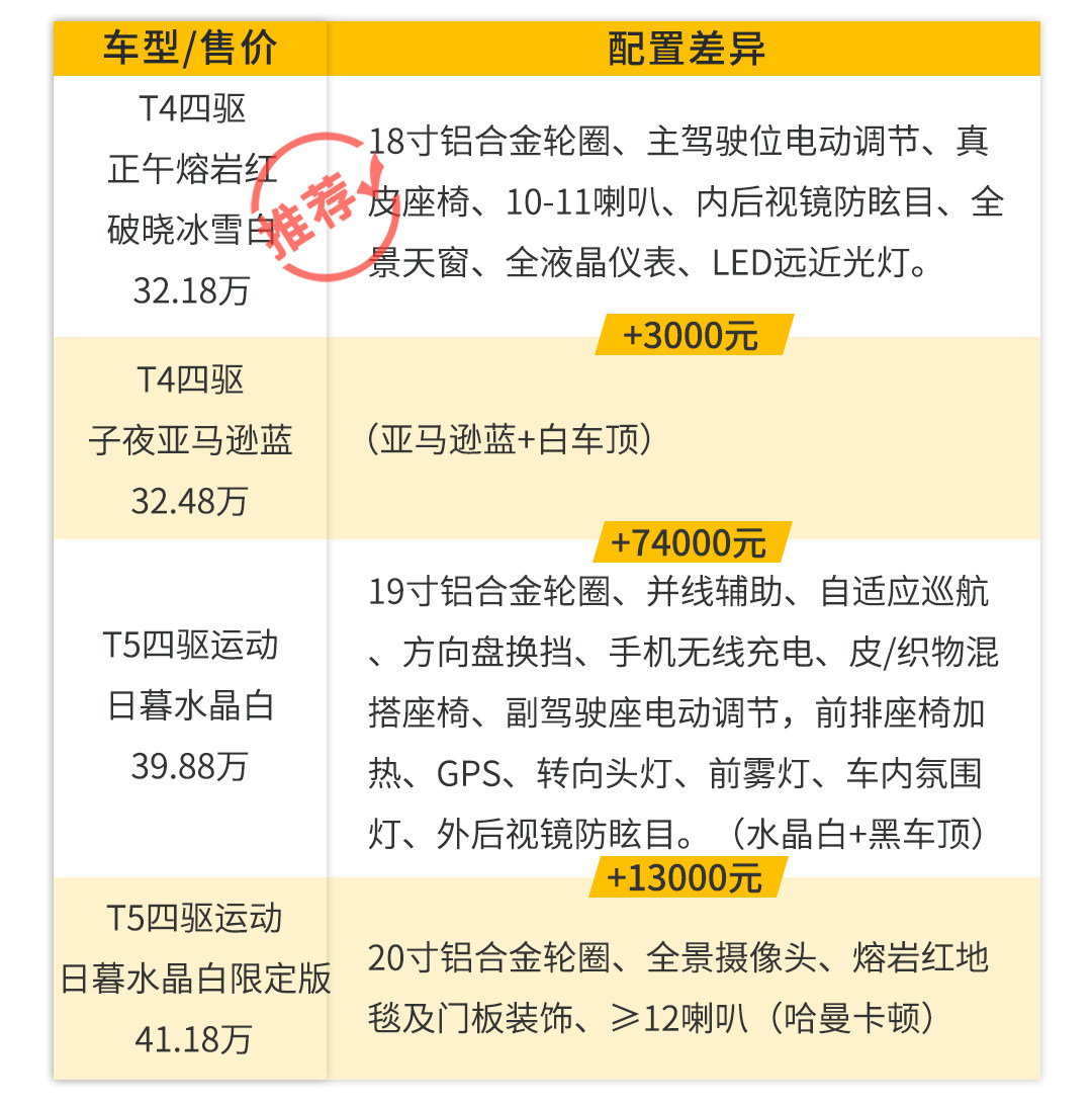 的确,从性价比的角度来看,最低配是最值得推荐的,该有的配置应有尽有。再其次是因为,上到T5动力的时候,加的动力不少,配置不少,钱更不少,但是刚刚已经说了T5动力对于这样一款SUV来说还是有点过剩了,而且加的配置也不会太实用。(亚马逊蓝加的钱都在车漆上,其他配置和最低配一样)不过只追求外观颜色的朋友更建议去后期贴膜,想要什么颜色都要。