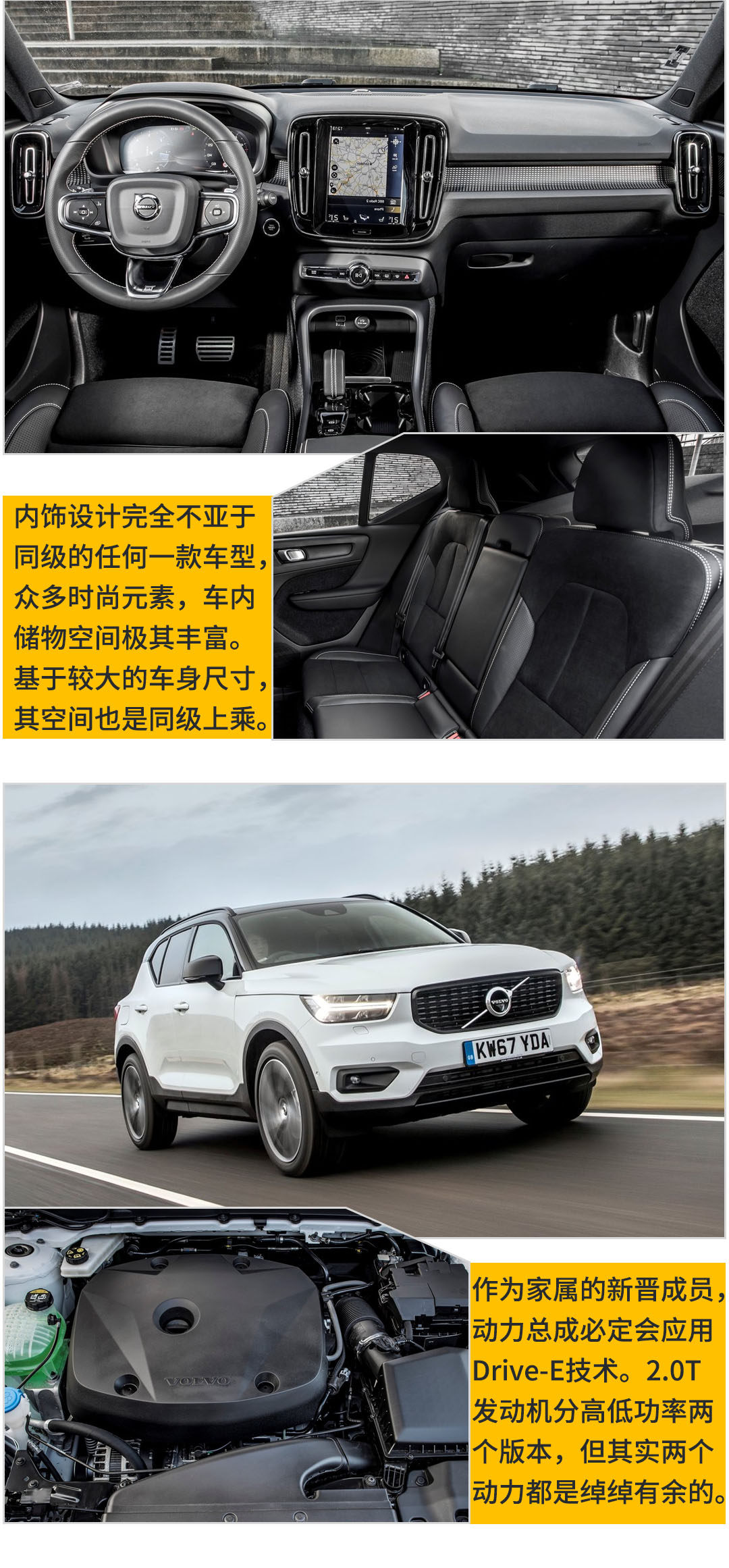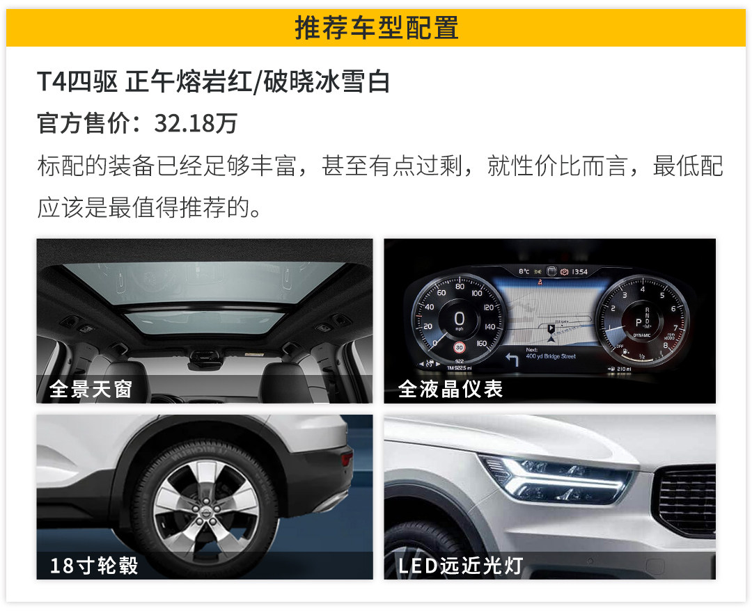说到动力部分,沃尔沃XC40不像其他竞品一样提供1.5L左右较低排列的车型,全系配备2.0T涡轮镇压缸内直喷发动,分T4和T5高低功率两个版本,其实这是因为沃尔沃的Drive-E动力技术必须遵循2.0L涡轮4缸。在动力上无疑是非常充足的,在账面数据上就有所体现。甚至T5动力对于这样的一款合适城市代步的SUV来说,真的有点过剩了,而且全系配备四驱系统,最后的结果就是32.18万起,贵得也不无道理。