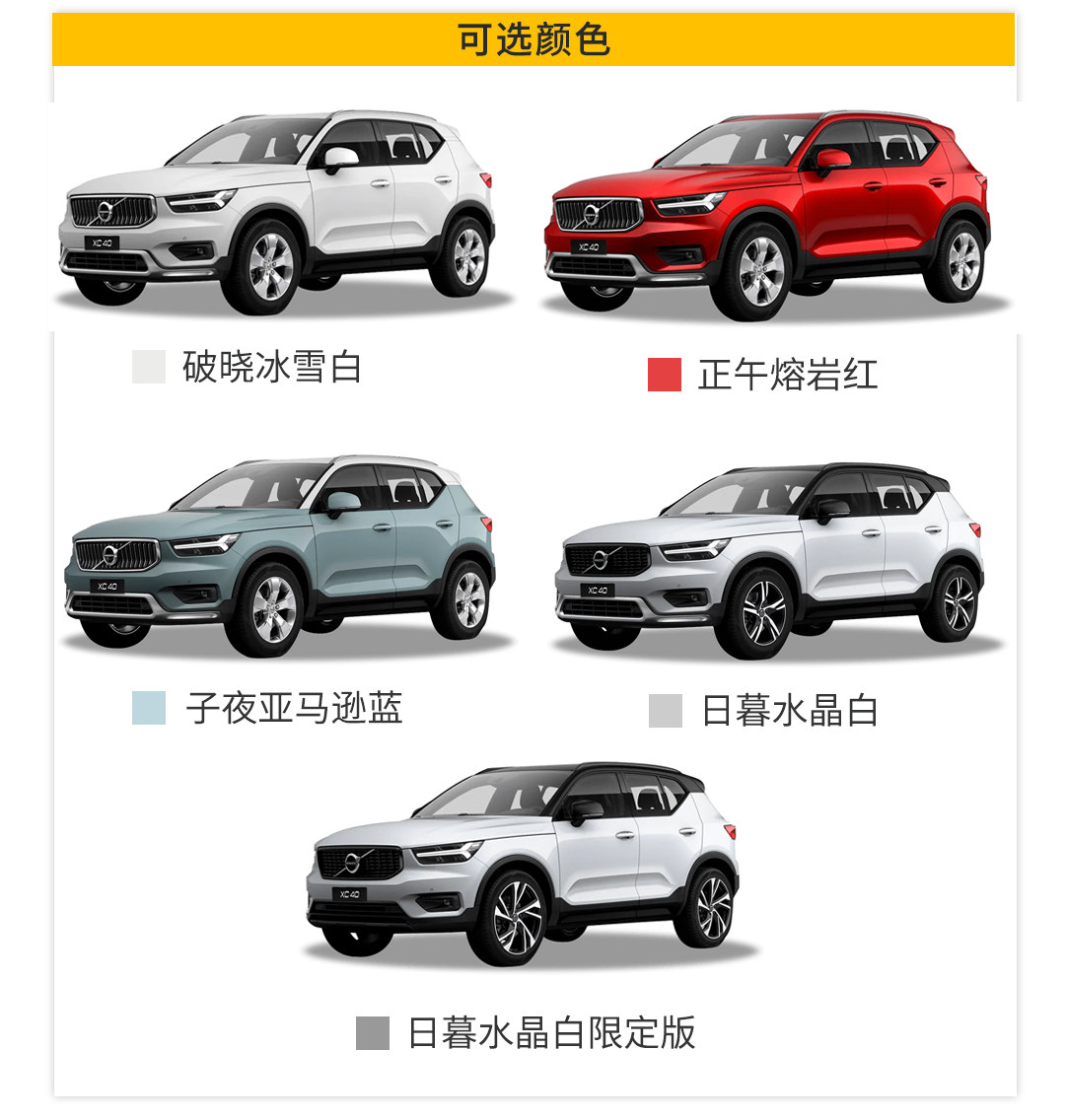 在车身颜色方面,沃尔沃XC40就真的是进一步提现出其个性之处,共推出的5款车型中,都分别有各自的专属车身颜色,其中两款顶配颜色一致。个人还是比较推荐低配的水晶白+黑车顶,最具气质且最别致,不过到底选不选还是得综合配置看看性价比怎么样。