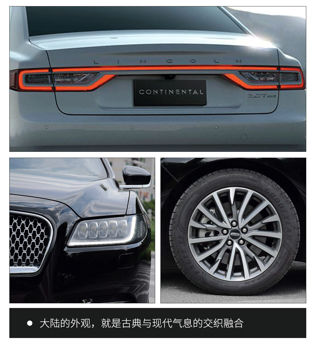 林肯大陆是历史上最著名的美式豪华桥车,曾于2002年停产,而这一代大陆是2015年复兴后的第一代,自然倾注了林肯大量的心血。复古+现代风格相结合的外观设计能够很好地迎合大多数消费者,特别是对纯美式设计不太感冒的中国消费者的审美,前脸的大灯和中网造型是林肯最新一代的家族设计语言,尾部贯穿式的车灯则是向上世纪七八十年代的老式美国轿车致敬,夜晚点亮以后会形成一个环状灯带,十分漂亮。
