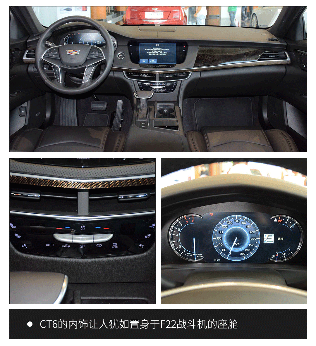 而到车内,CT6的全液晶仪表盘,全触控式中控台,大尺寸中控屏,棱角锋利的空调出风口,前卫的方向盘造型,还有类似飞机油门推杆造型的档把,都让人仿佛感觉置身于一架先进的F22隐身战斗机的座舱之中,完全感觉不到一点的老气。动力上更提供了一台405马力的3.0T双涡轮增压发动机,如此强大的动力同级少见,比同级别和排量的BBA车型多了差不多100马力,而且还是四驱,地板油全力加速时没有丝毫打滑,犹如战斗机打开加力燃烧室瞬间突破音障,在高速公路上就尽情让BBA们吃你的尾气去吧!