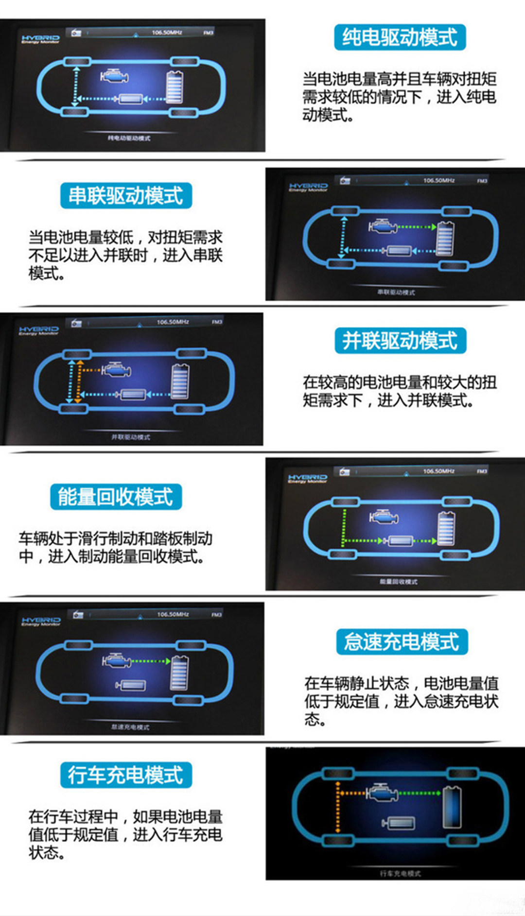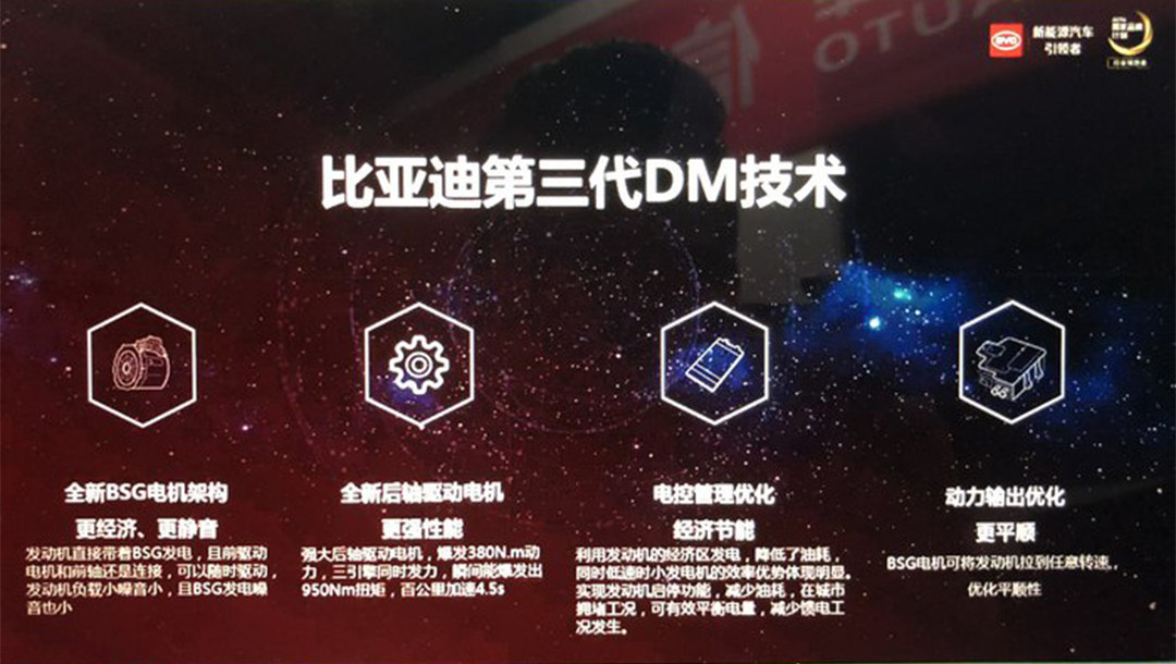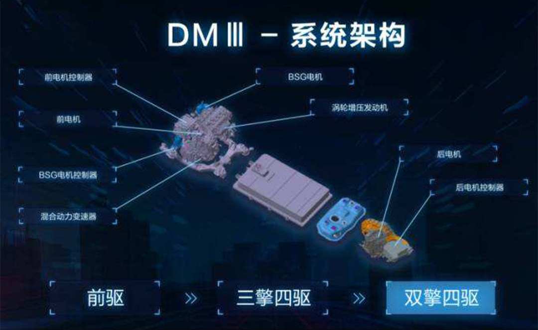 比亚迪的第三代DM的技术是整合了前后驱动电机+25KW/60N·mBSG电机再加上引擎的“一擎三电机”组合,在引擎及双电机共同协作的情况下能爆发出惊人的441kw功率以及950N·m扭矩,让其4.5秒便能完成零百加速。而且满电平均油耗仅为5.1L/100KM。