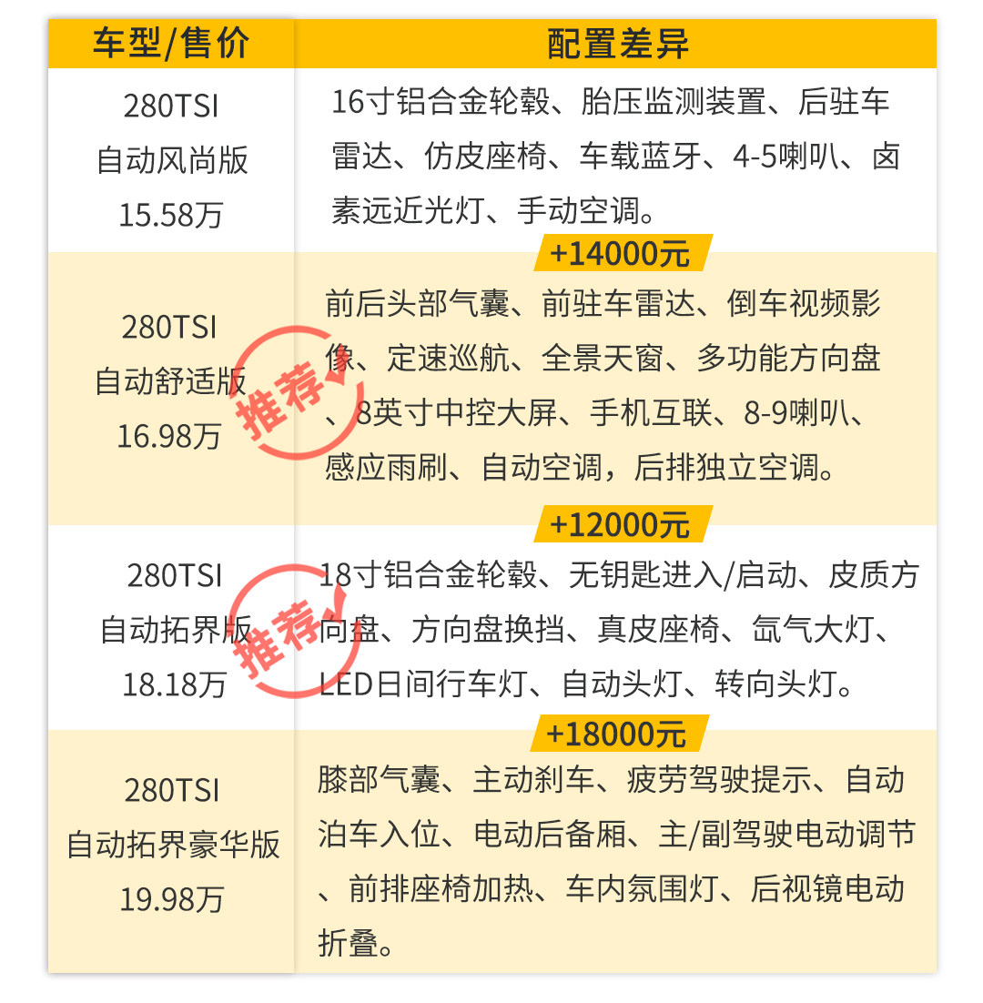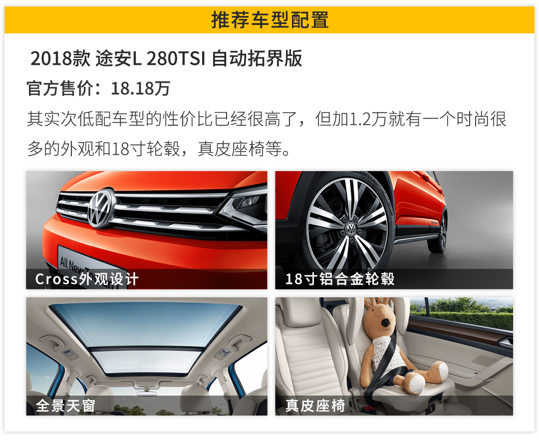 但最最最推荐的还是新增的拓界版,加1.2万元就能摇身一变跨界车型,即使不看其它配置个人认为都是非常值的,不过增加的18寸轮毂和真皮座椅也和有诱惑力。虽然综合18.18万的售价真的不便宜了,如果你真的看上了,建议先坐观其变,一段时间后,拿到1-2万的优惠也很有可能。