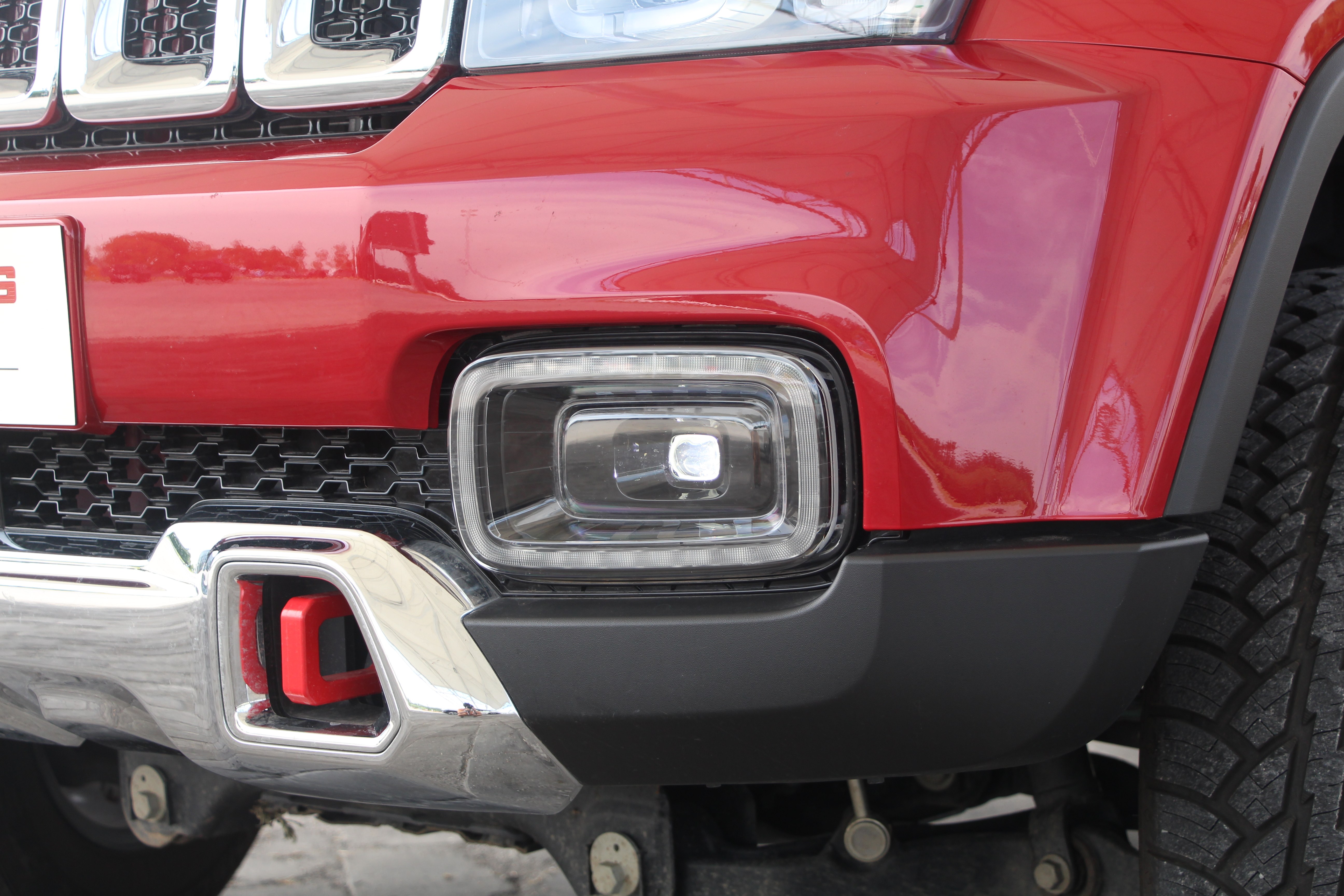 全黑大保险杠换成了铝制护板+LED日间行车灯+红色拖车钩组合,是时下城市SUV较为流行的设计,但时尚也是有代价的,就是这种铝制护板在越野的情况下,漆面很容易被损伤。