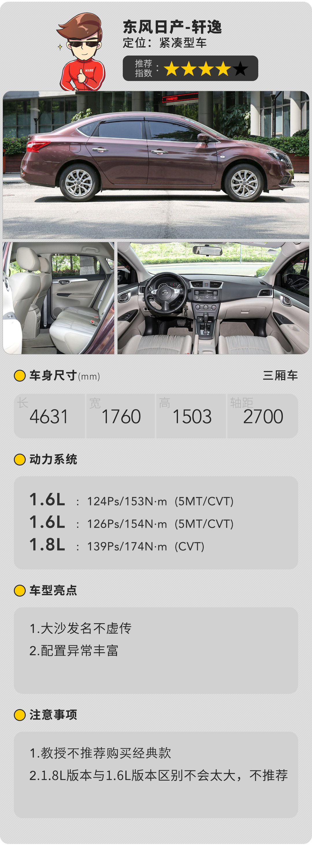 值得一提的是,轩逸虽然定位为紧凑级家轿,但2700mm的轴距已经达到了中级车的标准。而搭载的1.6L发动机百公里油耗仅为6.6升,如果怕1.6L不够力,还有1.8L版本可以选。但是教授不推荐买经典款,虽然价格更低,但就新款发动机配备双C-VTC连续可变气门正时技术而言,当然是有“新”买新。