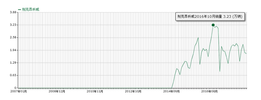 昂科威于2014年底上市后,第二个月销量就破万,虽然后来销量也有起有落,但整个走势是不断上升的,直至整个SUV销量前列,最高月销量达3.2万辆。