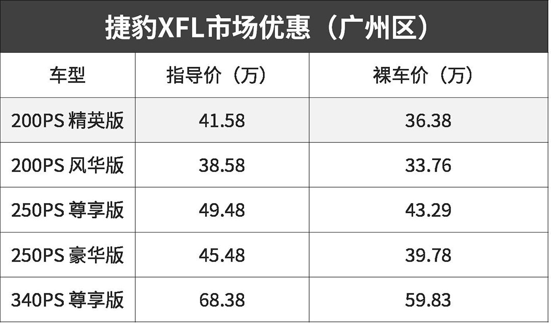 上图是教授从4S店公开信息中找到的报价信息,仅供参考。但也足以反应,买到八折的捷豹并不难,实际上如果选择一些金融政策的话,优惠程度还可以有一定增幅。对于一款中大型豪华轿车来说,这样的优惠幅度相当可观。捷豹在品牌层面上竞争力并不弱于德系豪强,也许是因为入华时间较晚,同时产品定价和营销政策上出现了一些偏差,导致市场反响不够好,在加上近年品牌被印度塔塔汽车收购,国产后又是“奇瑞捷豹”的前缀。消费者认知程度不高。但这都不能否定XFL本身的产品力。
