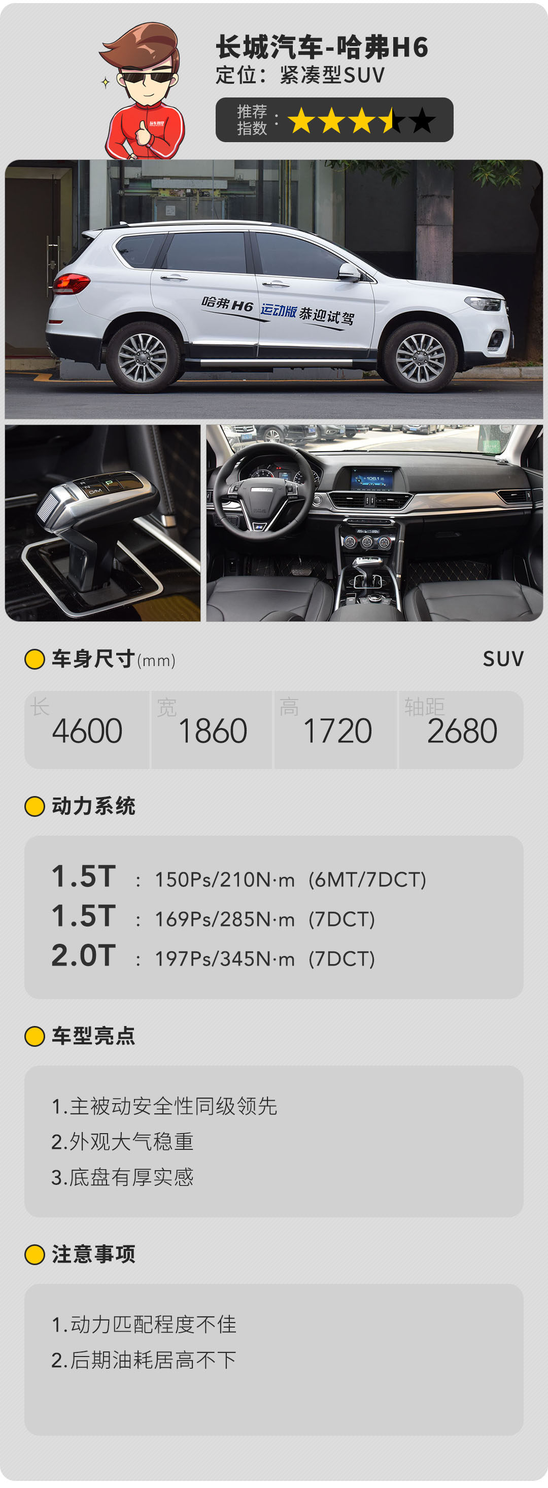 哈弗H6的优秀远比你想象中的要多。多达38项的安全配置,数次获得碰撞C-NCAP的五星成绩,模拟真实场景的翻滚事故测试。H6对于安全性的执念令教授印象深刻。再加上大气的外观,标志式的豪华内饰风格,如果能在动力匹配上多下苦工,H6就真的圆满了。