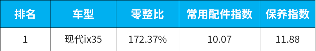 韩系车在国内境况可谓是每况日下,性价比仿佛成为了韩系车唯一的救命稻草,而后期使用成本则是衡量性价比中最为关键的因素之一。所以韩系车能成为合资车企中零整比最少的车企也就不足为奇了。而现代ix35更是以172.41%的零整比指数一举成为所有车型中的状元。