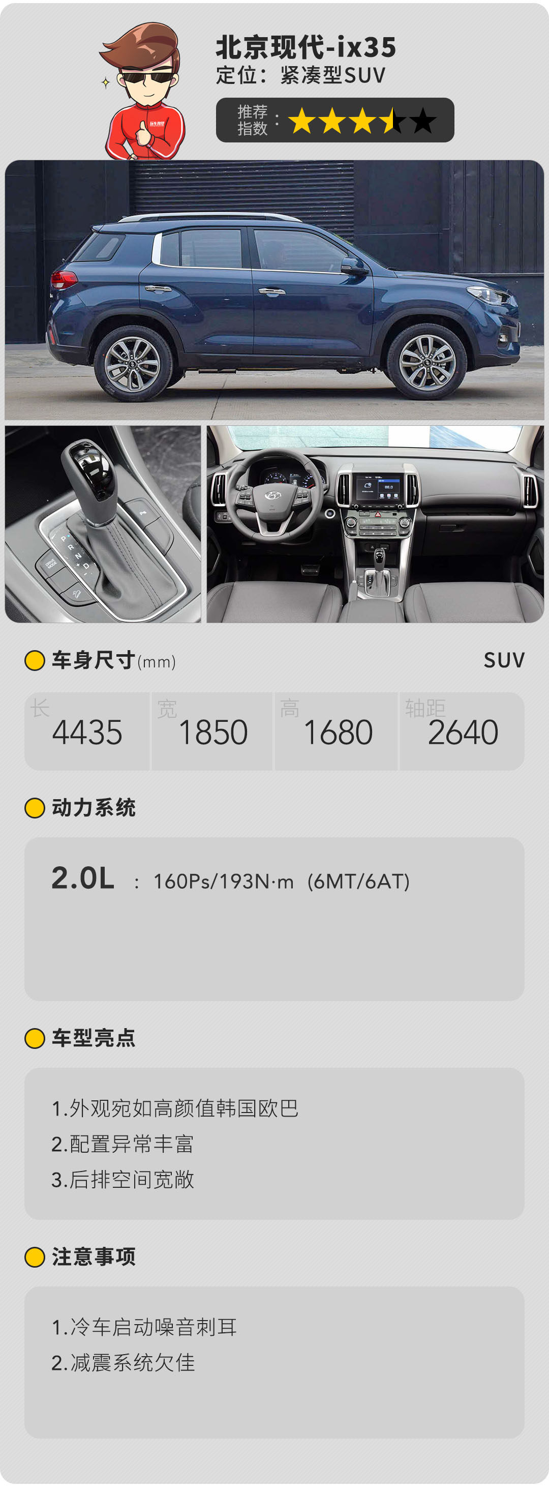 2.0版本的流体雕塑设计语言,赋予了ix35野性的硬朗气息,辅以实测后同级别领先的接近与离去角与经实测验证后不俗的四驱越野能力同时充裕的乘坐空间、丰富的配置供给,心有猛虎却仍能细嗅蔷薇来形容ix35再贴切不过。