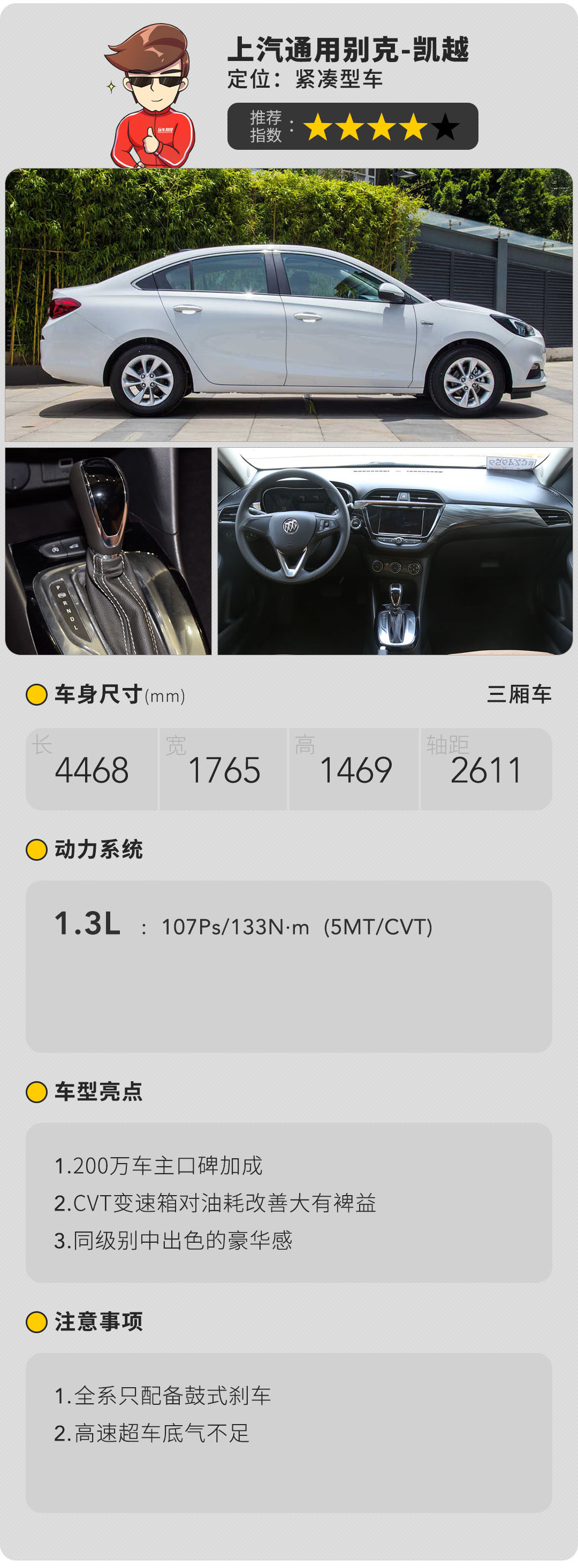 新凯越的杀手锏岂止一项。全新家族式设计理念的融入令凯越焕发新机,头灯科鲁兹、尾部英朗,整体却显露出几分君威影子,令外观呈现出越级的态势。廉价的内饰用料在高光纹理饰板的点缀下颇具高级感。而在驾驶层面备受诟病的6AT变速箱不复存在,取而代之的是以平顺性著称的CVT变速箱,1.3L三缸发动机抖动是无可避免的,可在出色的燃油经济性和优良的NVH表现的基础下明显是瑕不遮瑜。