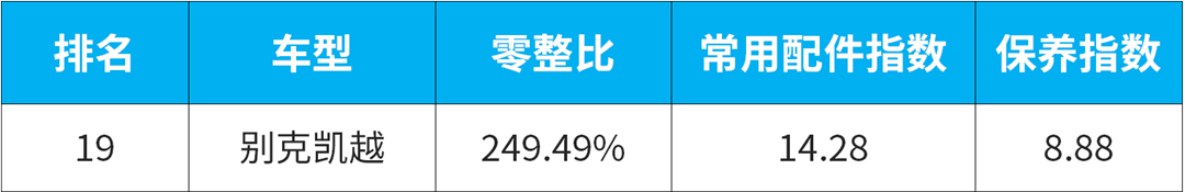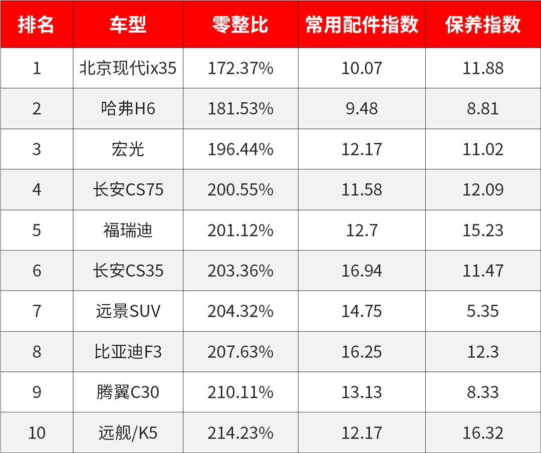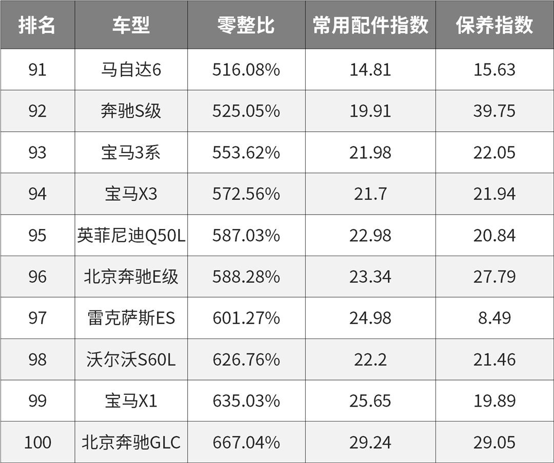 在每年4月份中国汽车维修行业协会联合中国保险协会发布汽车零整比100指数(仅限于100万以下的100款车型的排名)。