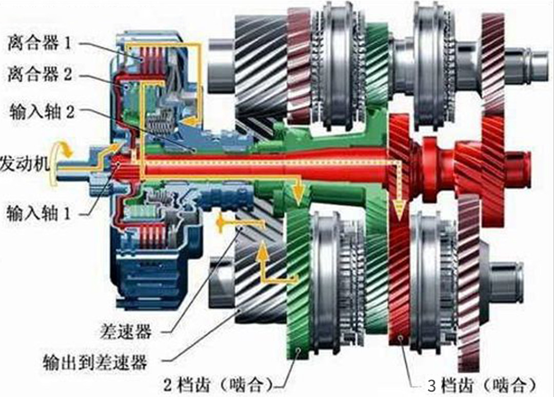其实双离合的结构并不是多么的高科技,区别于CVT(钢带传动)以及AT(液力传动),双离合是通过两个离合器,一个控制1、3、5档,一个控制2、4、6档。使用一档的时候二档已经准备好了,以此达到极快的换档速度的机械传动变速器。