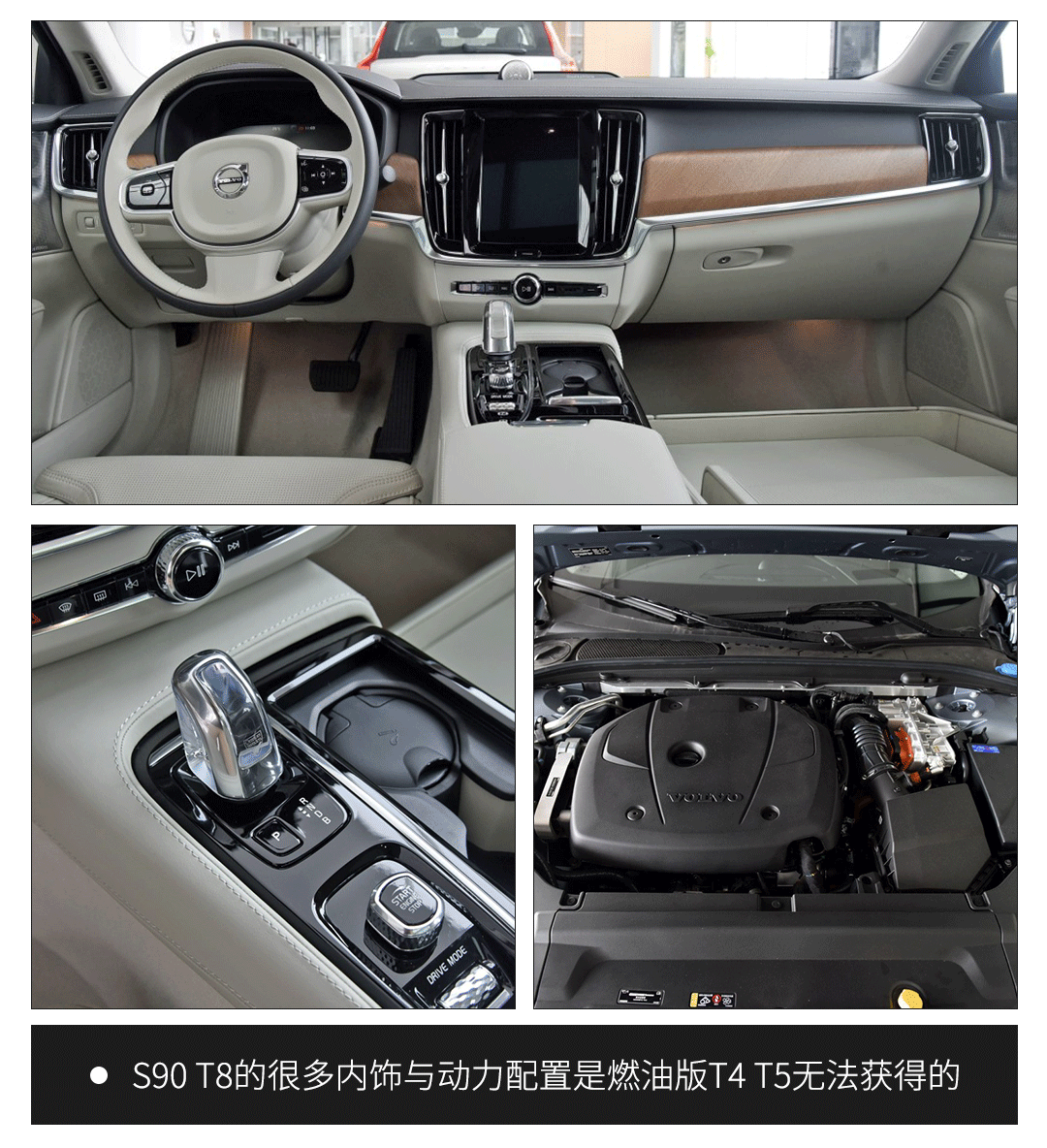 动力总成上S90 T8自然也是科技感十足,使用一台2.0T涡轮+机械的双增压发动机,匹配8速自动变速箱,前后各有一台电机,整套系统综合动力达407马力和640牛米,百公里加速4.9秒,这已经是很多8缸双涡轮增压汽油车的动力水平了!