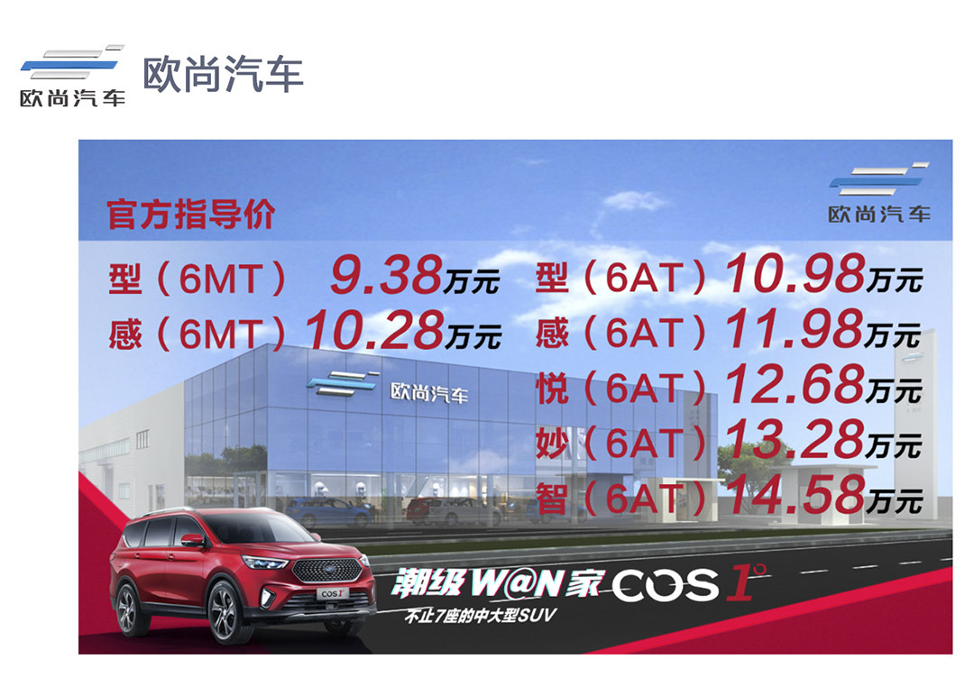 9月10日零点,全新品牌欧尚汽车旗下首款7座SUV——欧尚COS1°(科赛)正式上市,售价为9.38-14.58万元。