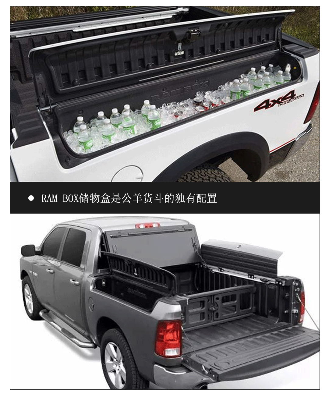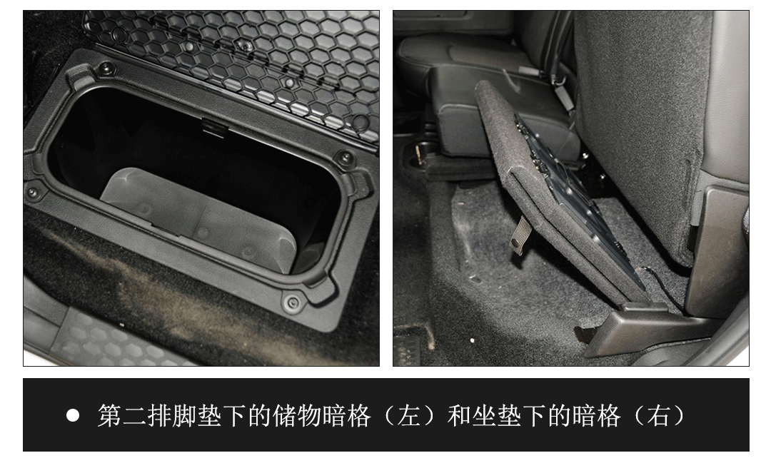 公羊的储物空间也和酷威一样暗藏玄机,后排左右两个座椅的坐垫向上翻起以后是一个暗格,座椅前面的脚垫下方也有两个很深的暗格,在中国这里可以放私房钱,就不怕被老婆发现了哈哈。此外,大部分在售公羊都选装了RAM BOX,也就是货斗两侧的长条形储物暗格,可以放比如拖车绳、铲子等一些随车工具,不过也牺牲了一定的货斗横向空间。