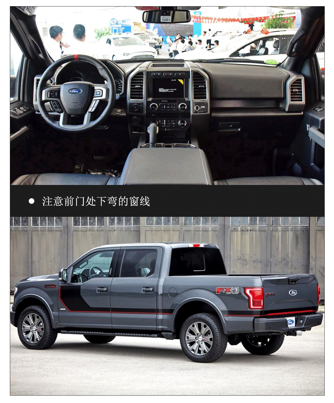 前脸的镀铬中网和4只大尺寸镀铬轮圈都是纯正美国车的标配不用说,F-150的主副驾车窗前半部分还有一个向下弯折的设计,对于这样大尺寸的车来说能够有效减少视觉盲区和剐蹭几率,方便越野看位,在路况更复杂的中国恰好更有用了!