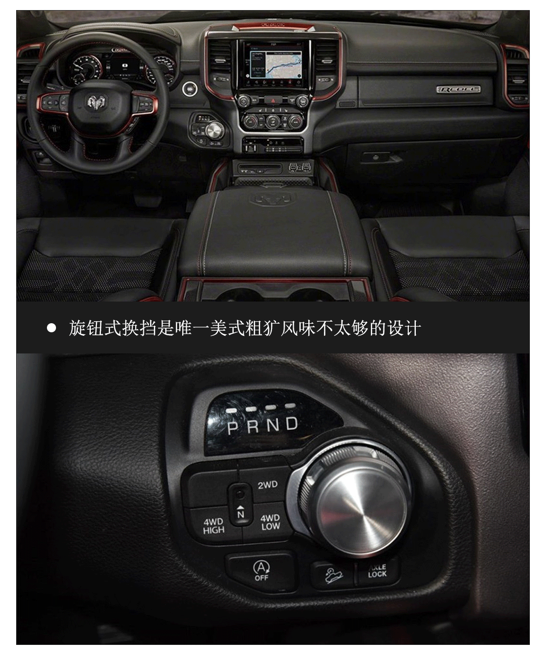 公羊的内饰是道奇的家族风格设计,咋眼一看还跟自家CUV车型酷威长得很像,自身的最大特点就是中控台上的旋钮式换挡,虽然看着显高档,但教授觉得太秀气,反而少了一丝美国皮卡的粗犷气息,是内饰设计唯一的不足。