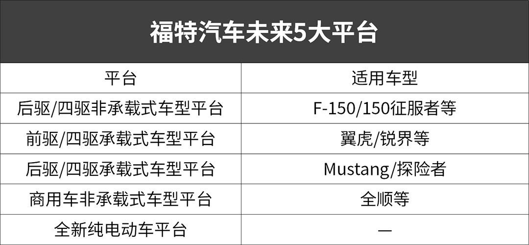 未来的5个平台将涵盖福特现有和规划中的所有车型,其中包含有一个后驱/四驱的非承载式车型平台,适用于F-150和征服者等;一个前驱/四驱承载式车型平台,适用于翼虎、锐界等;一个后驱/四驱承载式车型平台,适用于Mustang和探险者;一个商用车非承载式车型平台以及一个纯电动车平台。