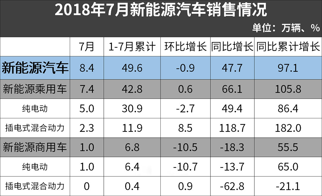 8月10日,中国汽车工业协会发布7月份汽车产销数据。1-7月份,中国新能源汽车销量达到49.6万辆。而在新能源乘用车细分市场,累计销量达到42.8万辆,同比增长105.8%,新能源乘用车市场依旧保持高增长状态。值得注意的是,在新能源乘用车市场当中,插电式混合动力乘用车销量达到11.9万辆,同比增长达到182%,高于纯电动汽车近100个百分点。