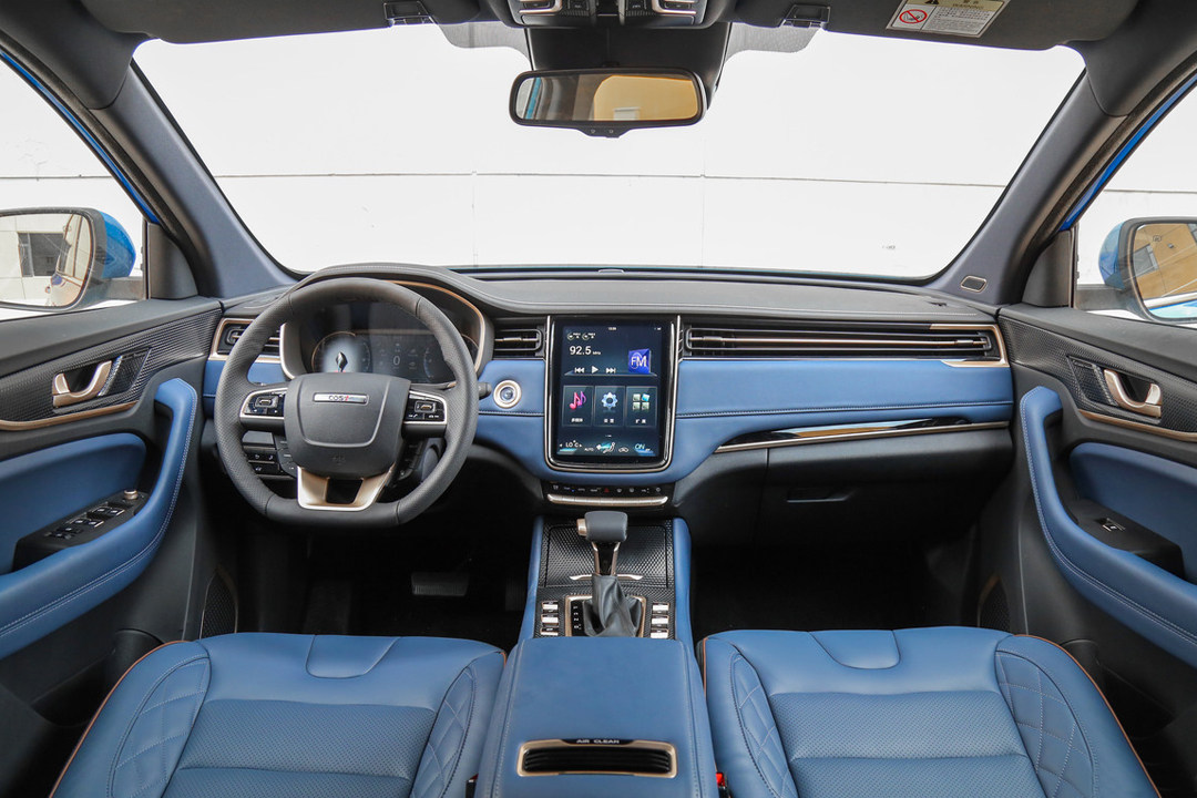外观看上去好像还没君马SEEK 5高级,为什么定价更高?一看内饰你应该就懂了。整个内饰真的让人眼前一亮,一套紫蓝的内饰大量软性材质覆盖,加以多处金色镀铬,咋眼一看,路虎揽胜创世既视感(有点夸张了),感觉用时尚来形容都有点牵强了,可能用“奢华”会更合适一点。