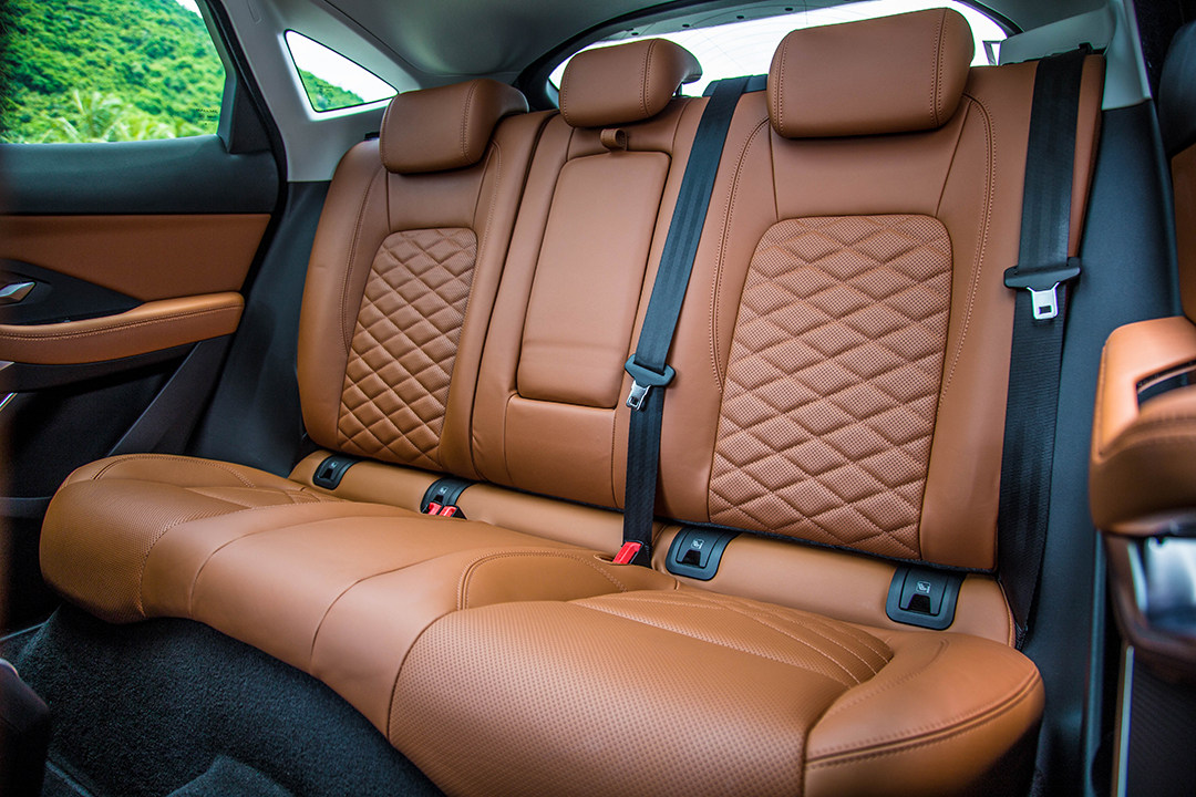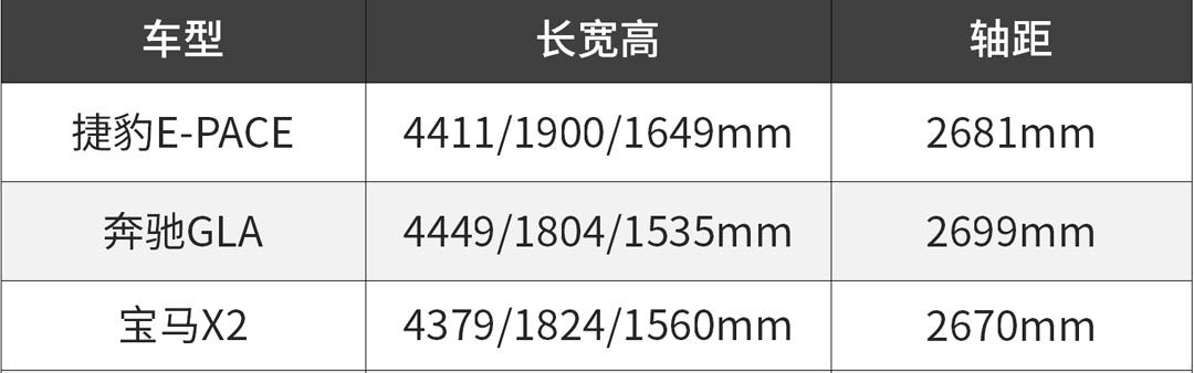 E-PACE的尺寸为4411/1900/1649mm,轴距为2681mm,这样的尺寸相比同级车型来说没有优势,不过1900mm的宽度确实比对手强一些,捷豹路虎的车型由于喜欢采用环抱式设计,加上门板/座椅设计比较厚,因此往往在空间上不如看上去那么大,不过E-PACE则正好相反,尺寸虽然不大,但是内部空间还是很充裕的。