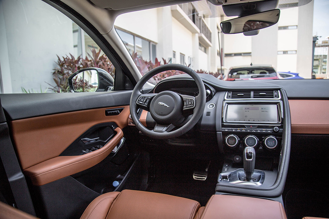 在内饰上E-PACE和自家的F-TYPE就更加相似了,中控台的造型和F-TYPE几乎相同,环抱式的内饰设计很有运动感,而且在挡杆造型上E-PACE也和F-TYPE一样采用了电子挡杆。和捷豹路虎其它使用旋钮挡杆的车相比,E-PACE显然更有运动感。而且在内饰材质上E-PACE大量使用软质材料和皮革,高档感比较好。
