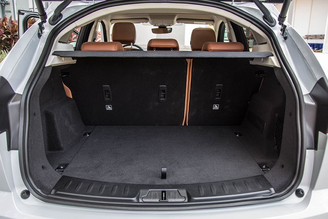 作为一款豪华SUV,E-PACE在储物空间上也没有忽视,在挡杆前方有放置手机等小件物品的区域,挡杆后方还有两个杯座,中央扶手箱、车门储物格和手套箱的容积也足够使用;E-PACE的后备箱常规容积为484升,在SUV中属于中等水准,比起竞品宝马X2和奔驰GLA来说要稍微大一些,后排座椅放倒后E-PACE的后备箱容积能够达到1141升,不过遗憾的是后座放倒后不能形成一个纯平的空间,在E-PACE的后备箱里还有四个锚点和一个网兜可以固定行李,细节考虑还是比较周到的。
