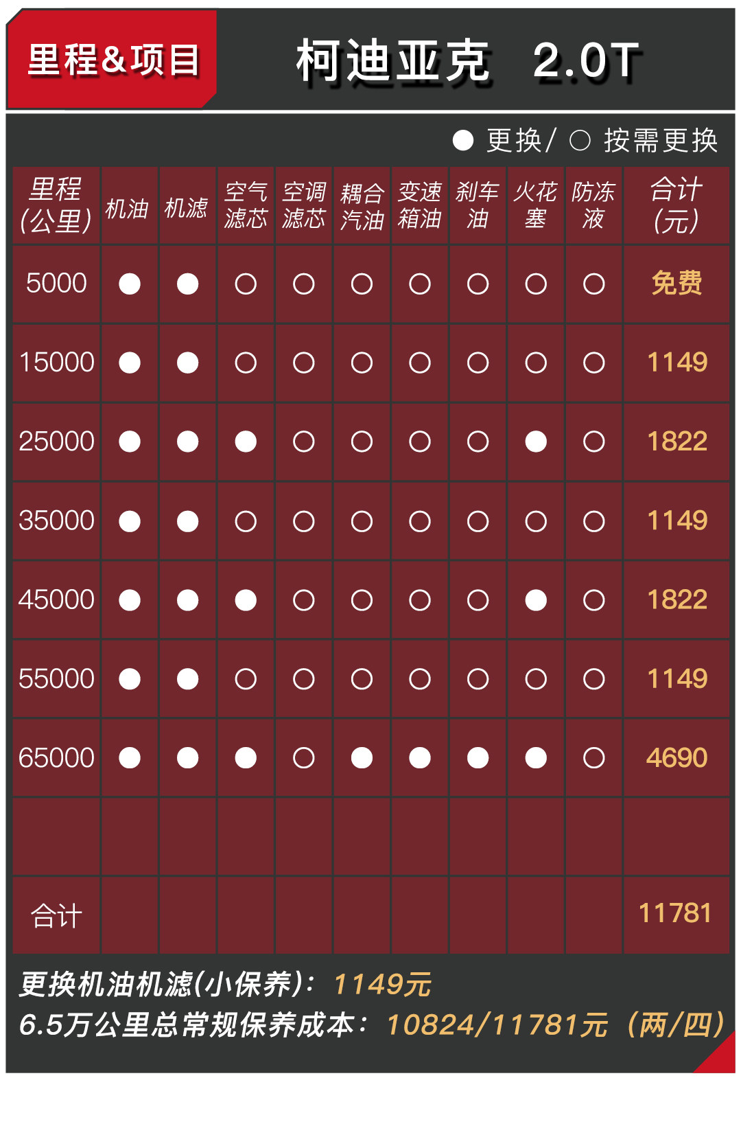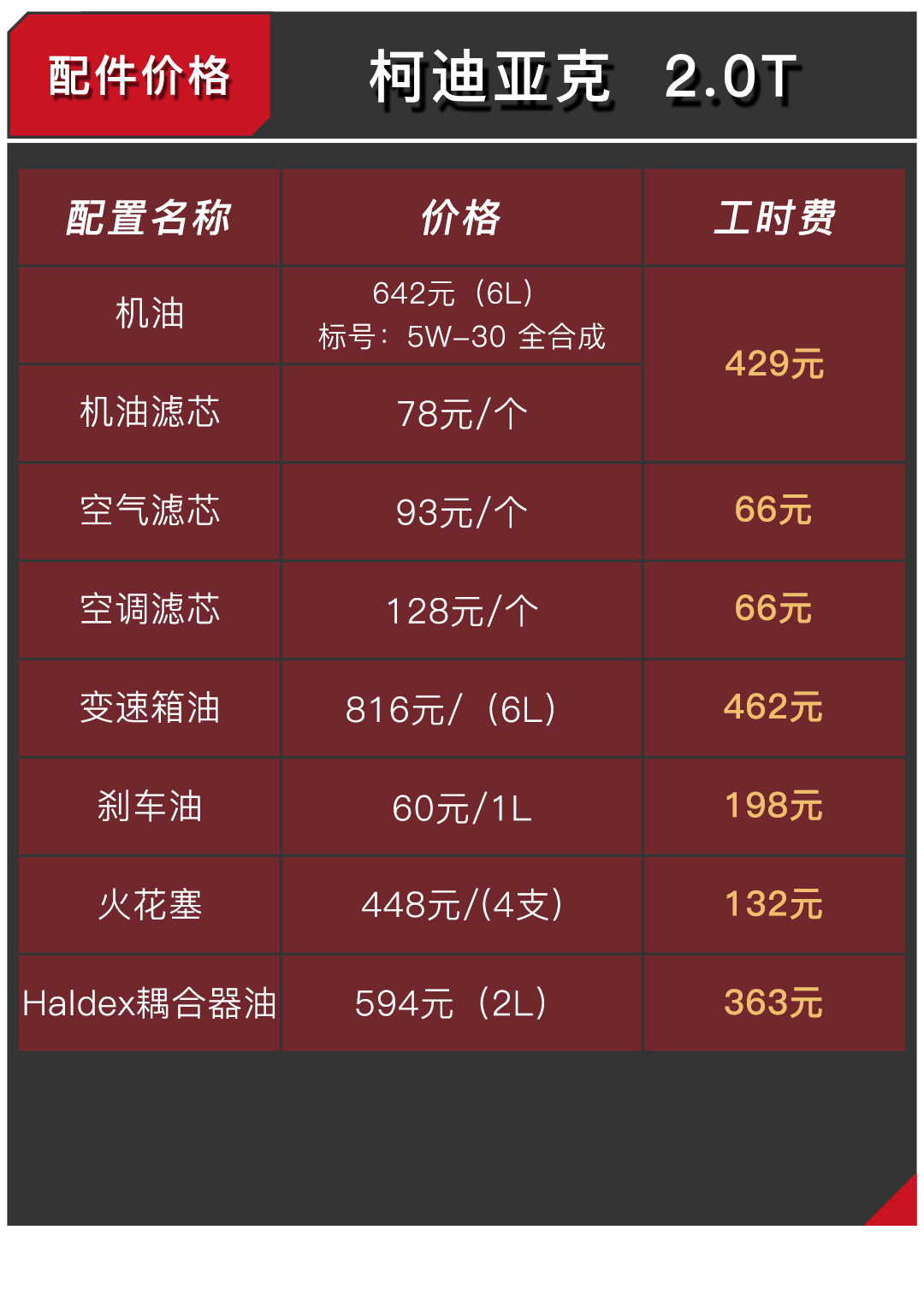 柯迪亚克在保养方面有所往大众看齐,就保养费用本身来说,配件价格比较常规,但工时费略贵,总保养费用整体看上去也稍微有些偏贵,不过好在其10000公里为一保养的保养间隔比较长,油耗并不是很高,油费表现较亲民。其次,如果当地4S店有工时费的折扣活动,柯迪亚克的保养成本还有进一步降低的空间。