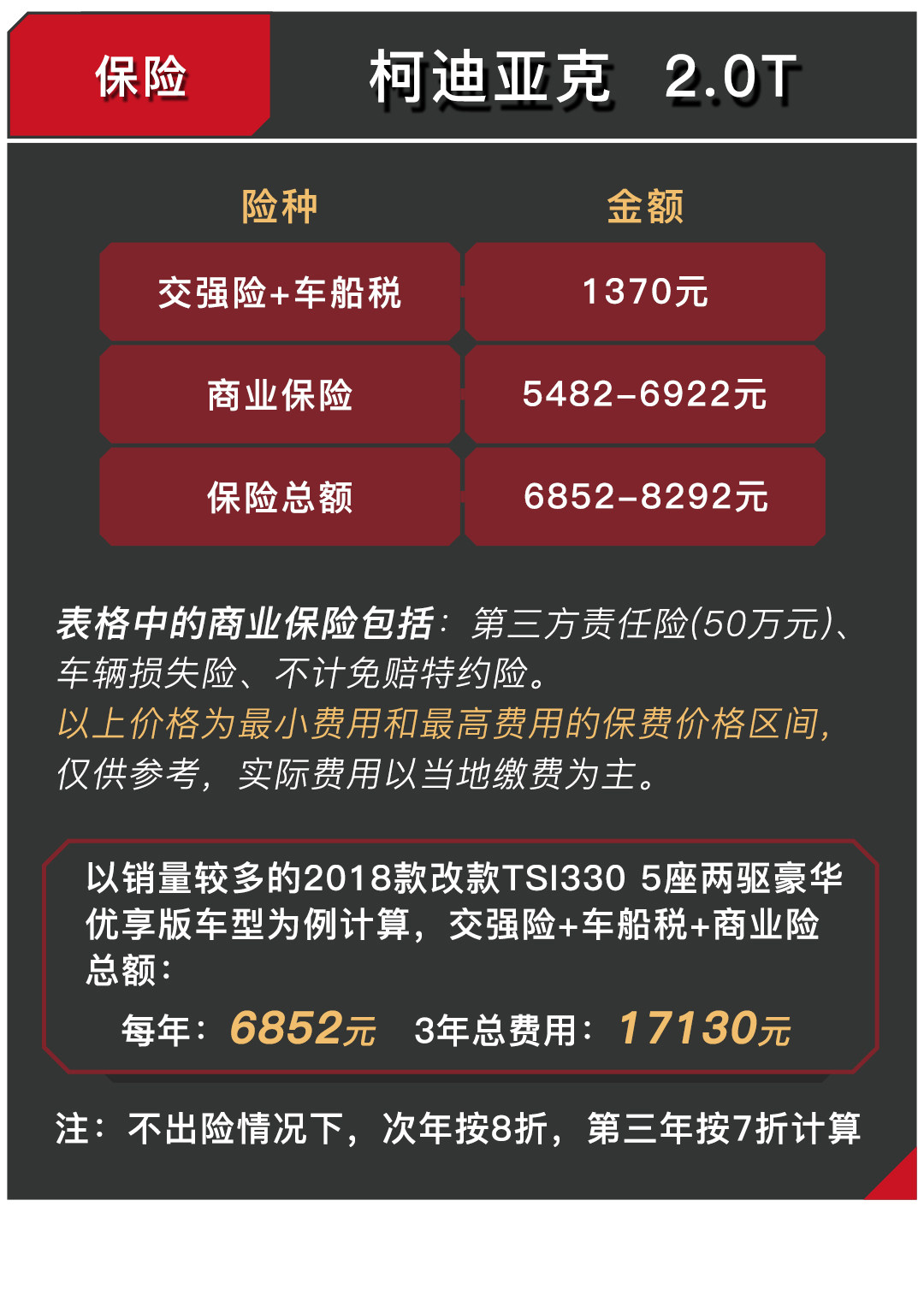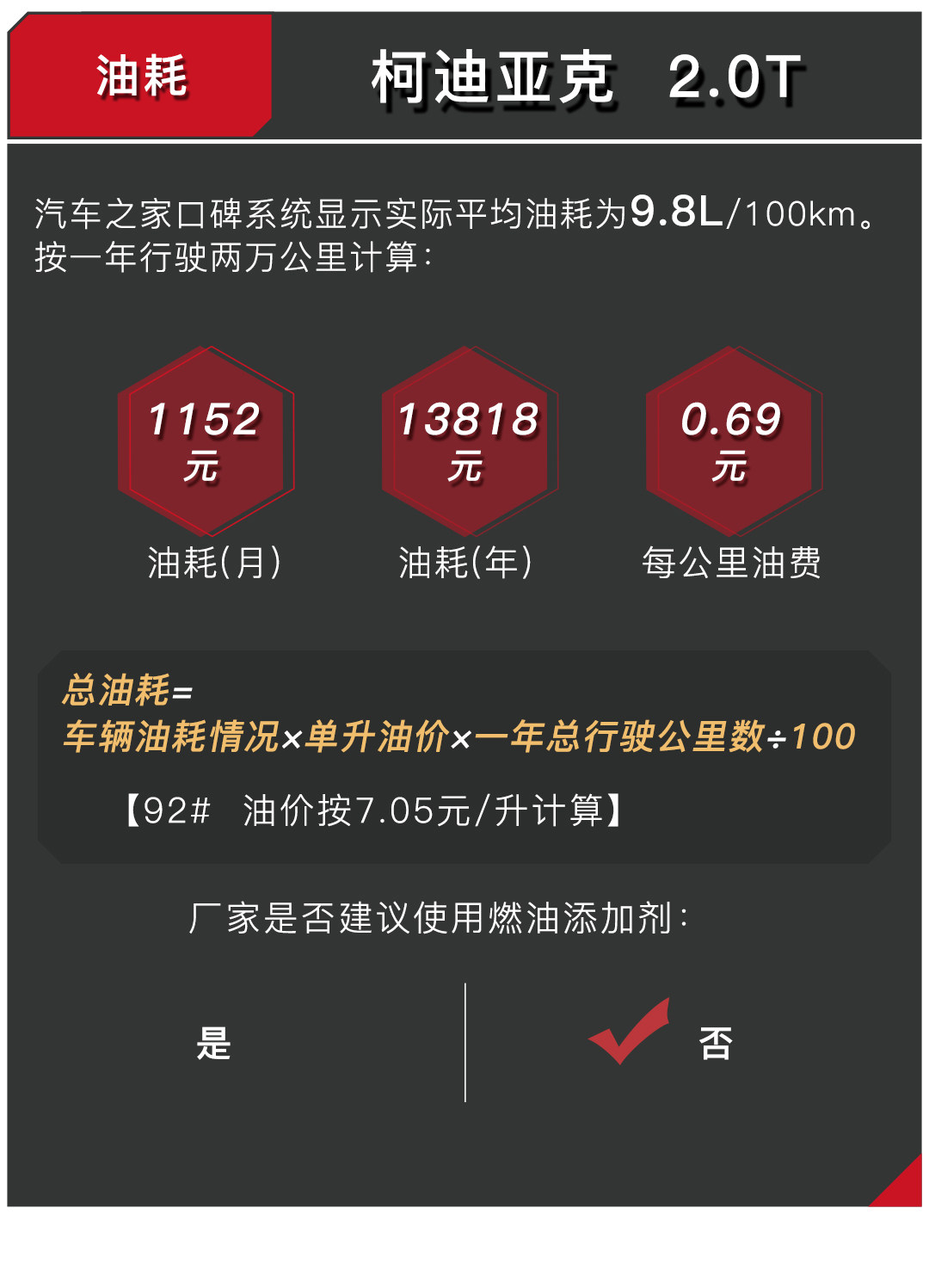 从图表数据看,柯迪亚克的这半年多的销量成绩并不算太好,但是教授认为,面对探界者、途观L、昂科威等强有力的竞争对手,能有此成绩还是值得肯定的,毕竟销量也不是衡量一款车好坏的决定性因素嘛。销量成绩不理想,那么是否和它的用车成本也存在比较大的关系呢?话不多说,我们赶紧看看它的后期养车成本表现如何?